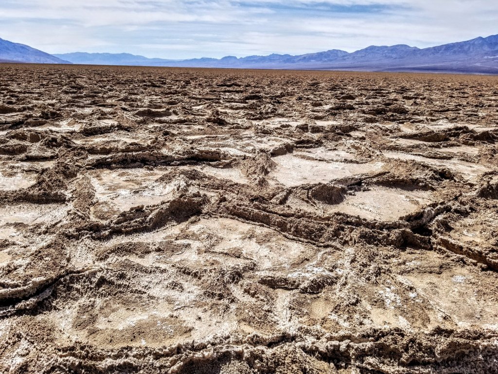The texture and terrain has changed since I last crossed this spot. Previously this area was known for the 12″ high razor sharp salt crusts that formed hexagonal shapes which you had to step over or risk cutting your legs. Now, they are much lower and less pronounced, there is less white salt and more brown crusted mud but this landscape is still so unique. I feel honored to be of the few who set foot on this alien landscape.