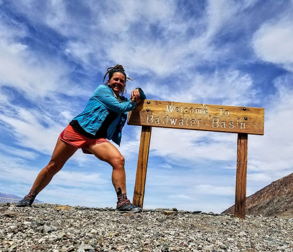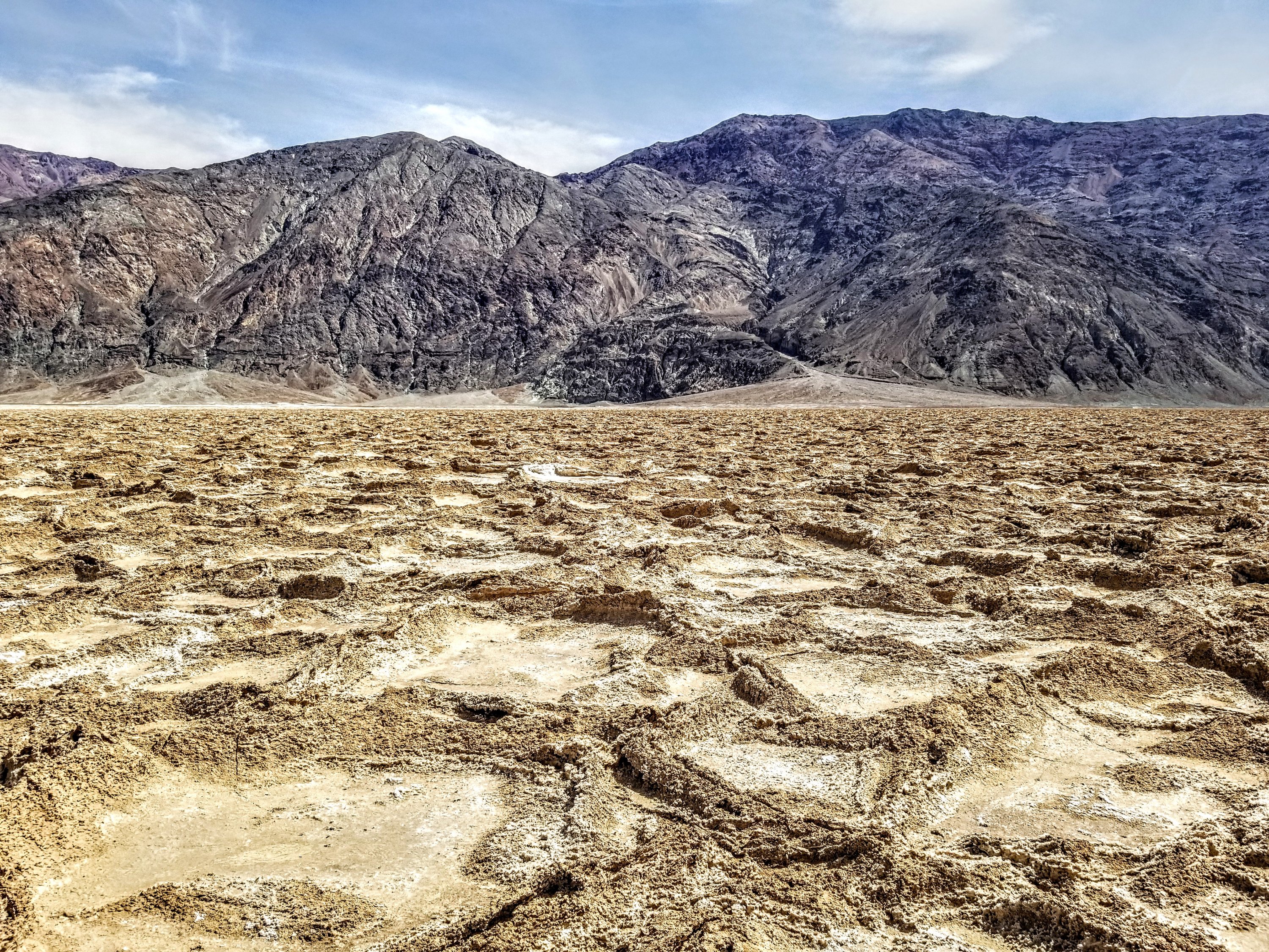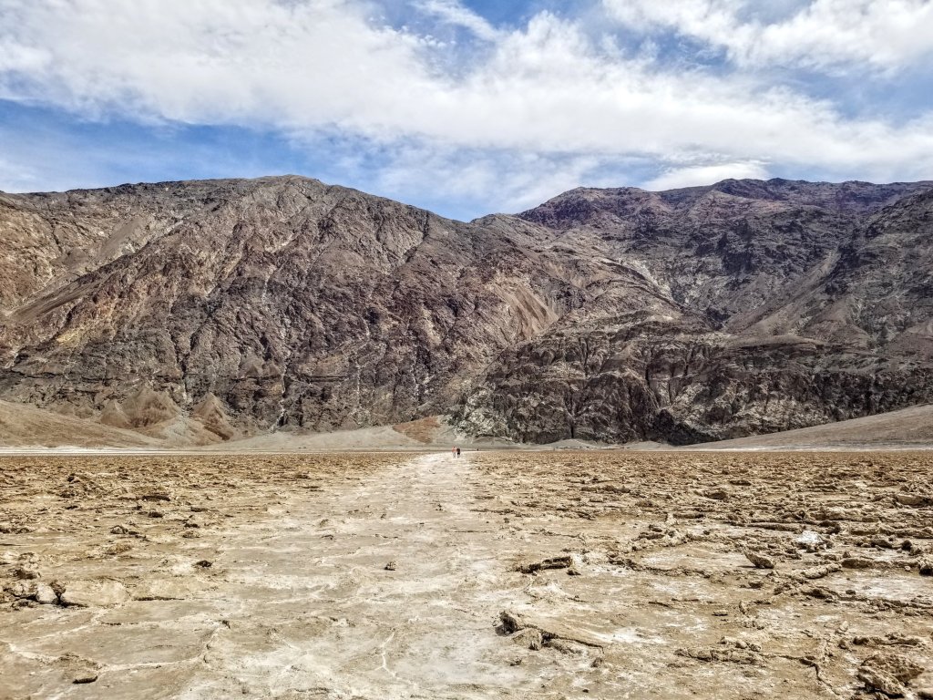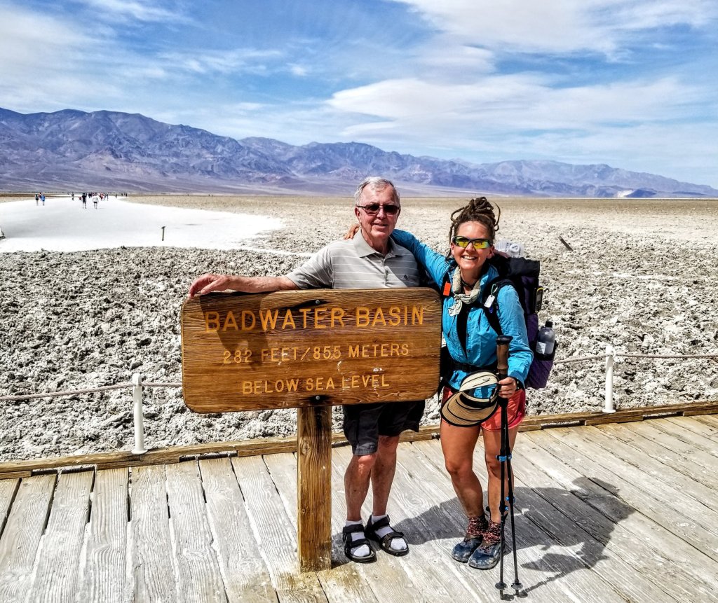 When I reach the boardwalk, I can see my Dad up at the parking lot, leaning on the railing. We wave to one another and soon we embrace with big smiles. The sun is baking down on this black asphalt parking lot but the wind has died down enough to have a conversation. I drag him out to the Badwater Basin sign for a finishing photo and several jovial folks chime in and offer to snap a few for us.