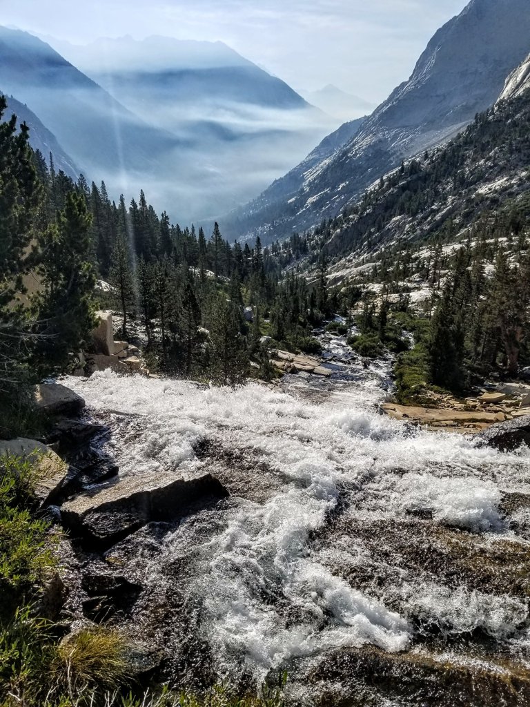 We set off in dusky light. The steep walls on either side prevent the sun from pouring into this enormous valley. We are following along the middle fork of the Kings River and I’m loving the dramatic Yosemite-like walls towering above. I never tire of walking this section of trail, even if it is a long-ass climb. With the backdrop sound of the flowing water we slide into a mellow groove and our muscles adjust to another day of walking. As we gain some elevation we begin to realize there is actually smoke settling into the valley. Wow, didn’t realize we were sleeping in that. It looks pretty bad. Even still, the cool morning air is perfect for our climb, and the sunlight filtered through the haze does lend to something of an ethereal feel.