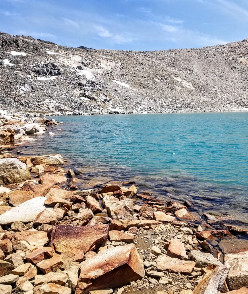 When we arrive at Helen Lake we are thirsty and starving and there is this most amazing turquoise water and a perfect grassy spot to sit upon. We have found our lunch spot for the day. Christy accidentally drops her O-ring from her Sawyer in the water and I quickly volunteer to fish it out with her trekking pole. The icy cold water feels truly amazing on my fatigued legs.