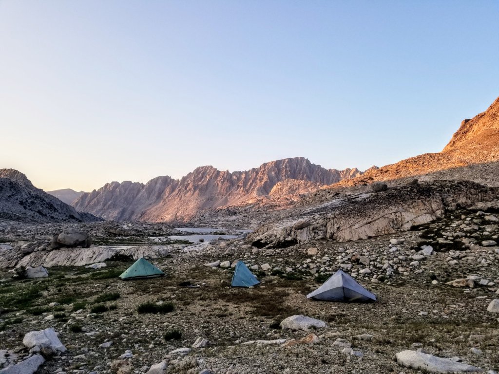 Finally, we spot something that looks possible way off in the distance almost like another mirage. We start making our way over there and find it is something we can make work. It takes a little creativity yet we will call this pkace home for the night. Done! Despite the haze from the smoke, we still have incredible views of the Evolution Basin ridgeline. That towering massif is home to several peaks above 13,000 ft and truly never gets old to look at.