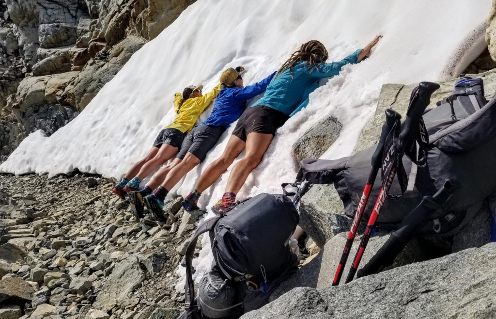 Climbing, climbing we are baking in the sun now, and since we are taking freqent breaks, we stop to make snow angels in a little bit of left over snow. The sensation of ice on my skin is such a dramatic contrast to the intense heat of the sun, it almost hurts, but it hurts so good.