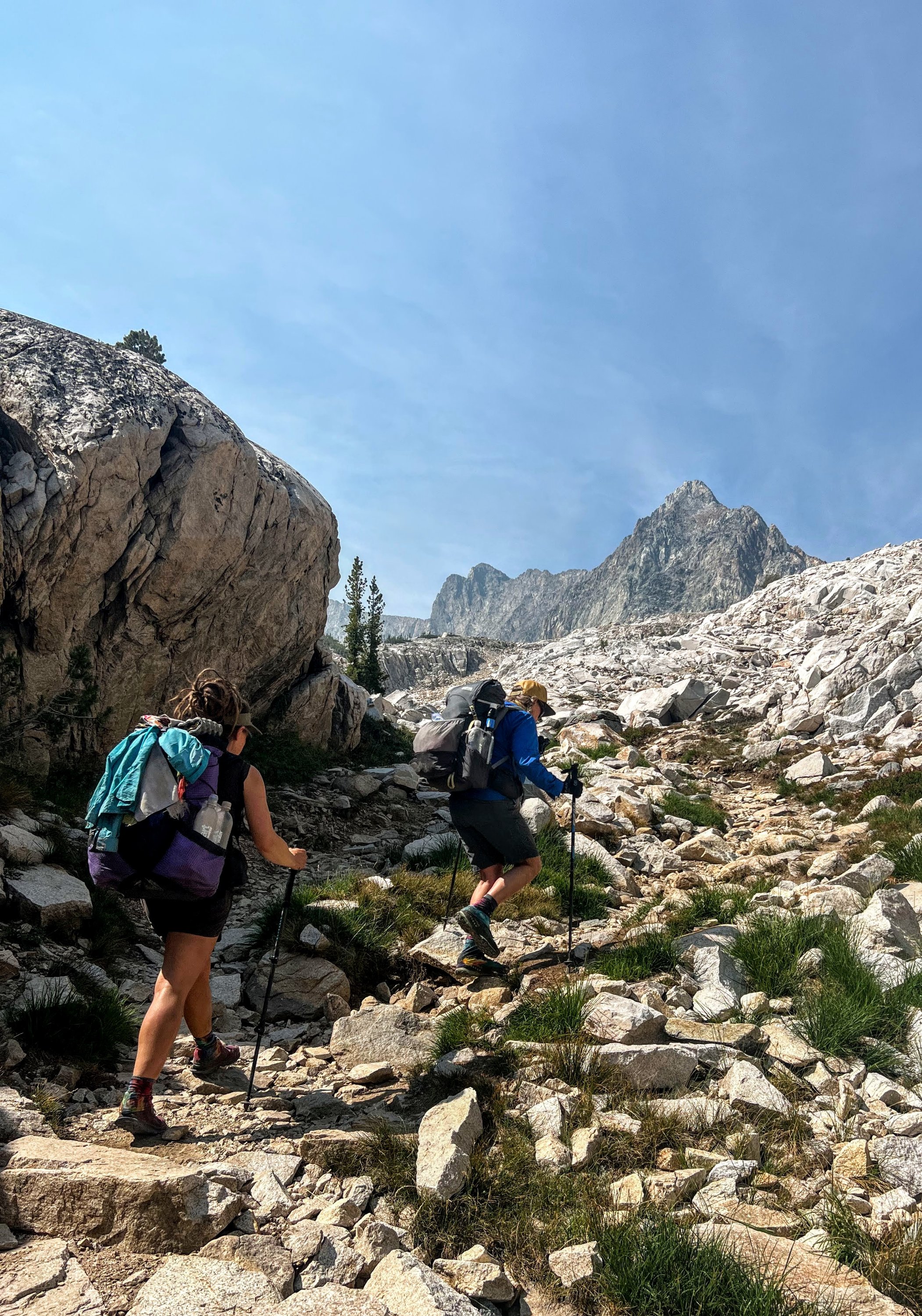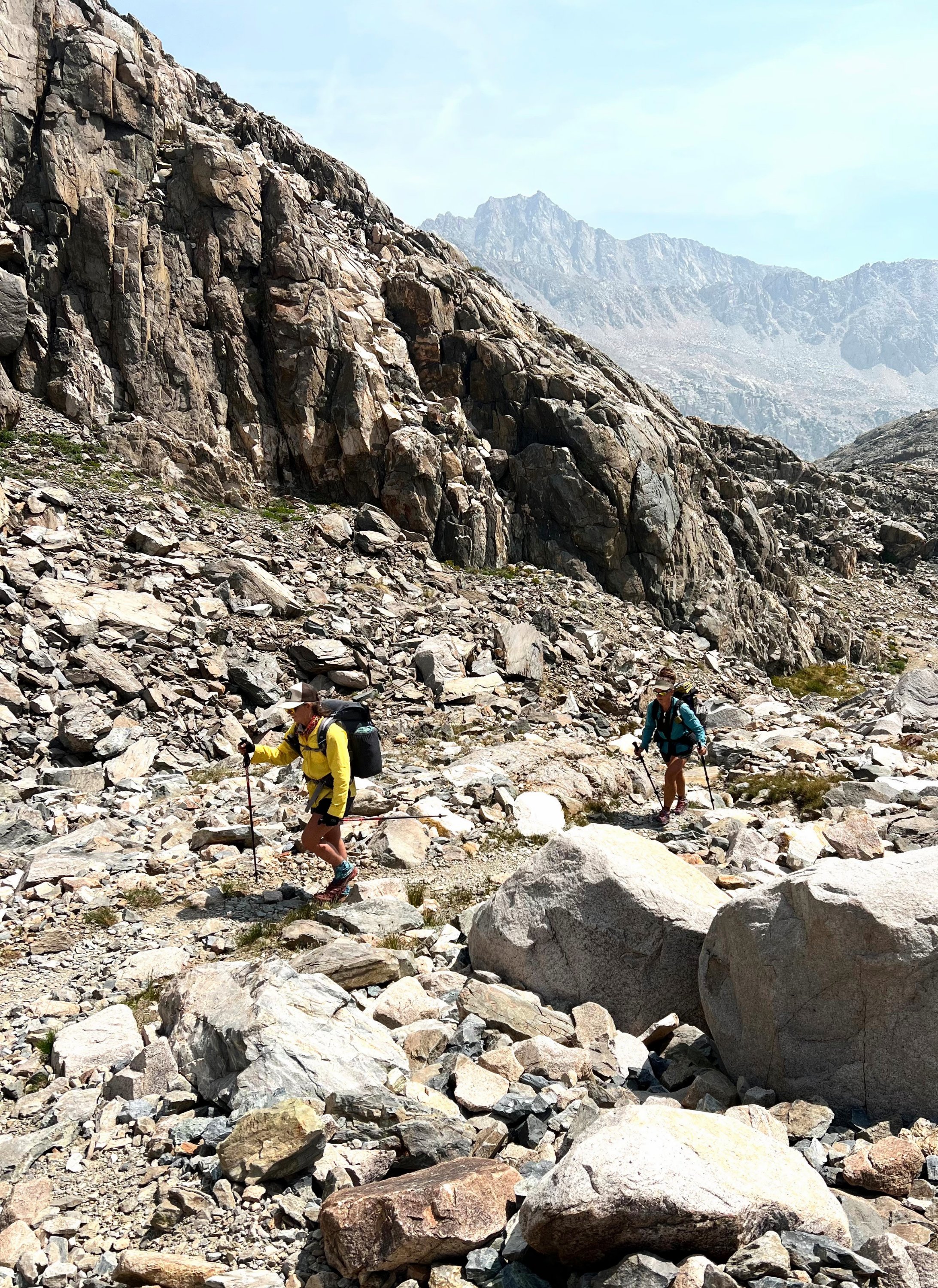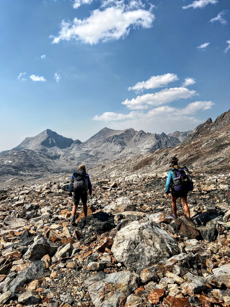 After this very extended lunch we are motivated to get off trail and hike up to Black Giant Pass. The name in and of itself sounds intimidating to me, and, it’s something that’s loomed in my mind for years. We read over Skurka’s notes and while it says the pass is more diffcult than it looks we just can’t imagine this is the case and think it might be a typo. We pull out our maps and ascertain it’s only about a 400 ft ascent above the little tarn below it. How bad can it be, right?