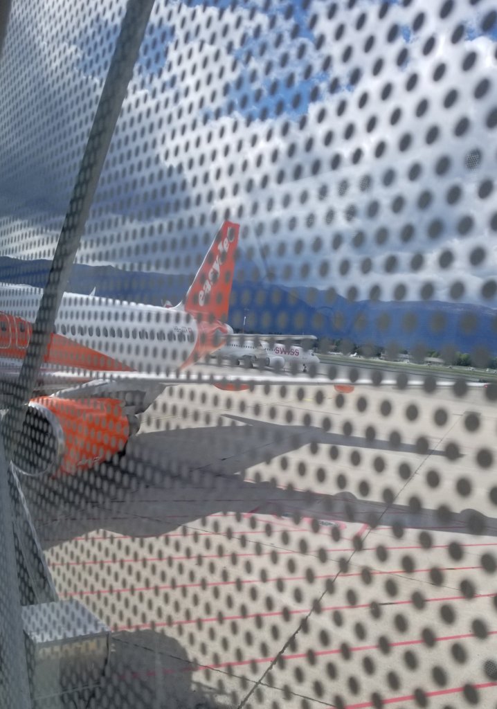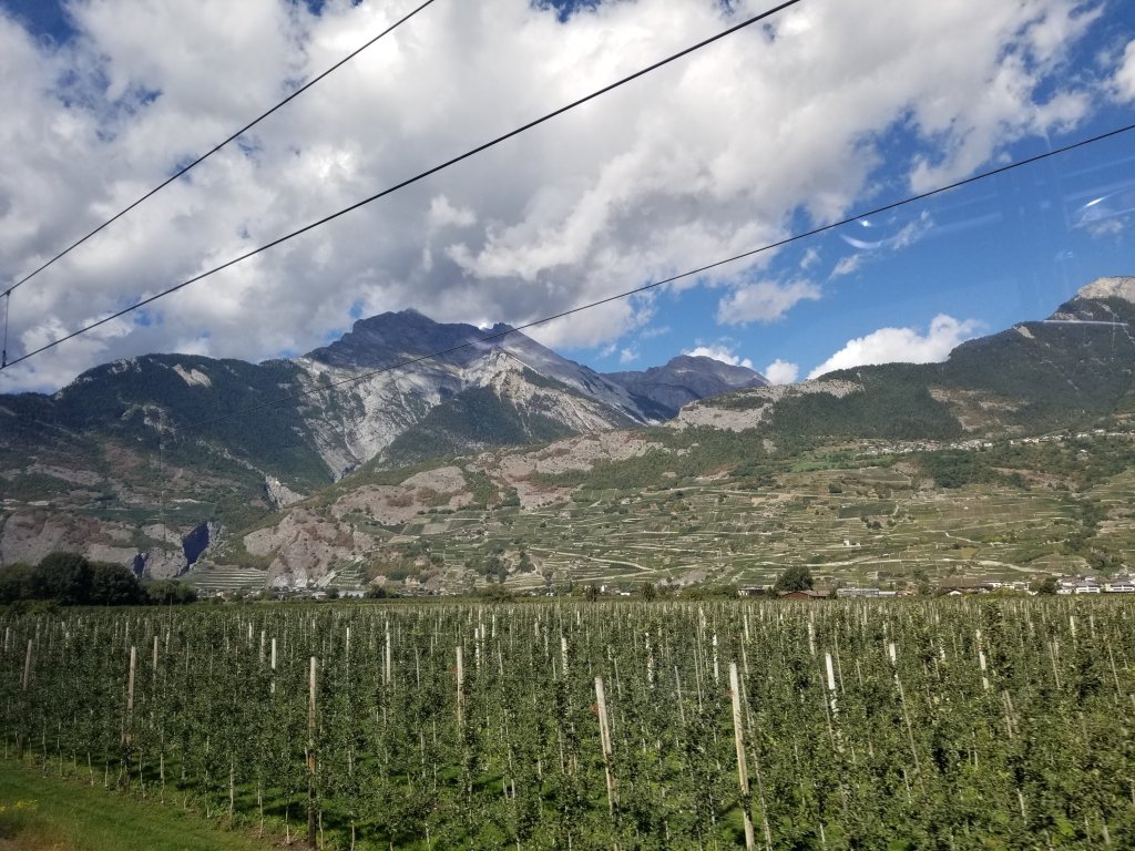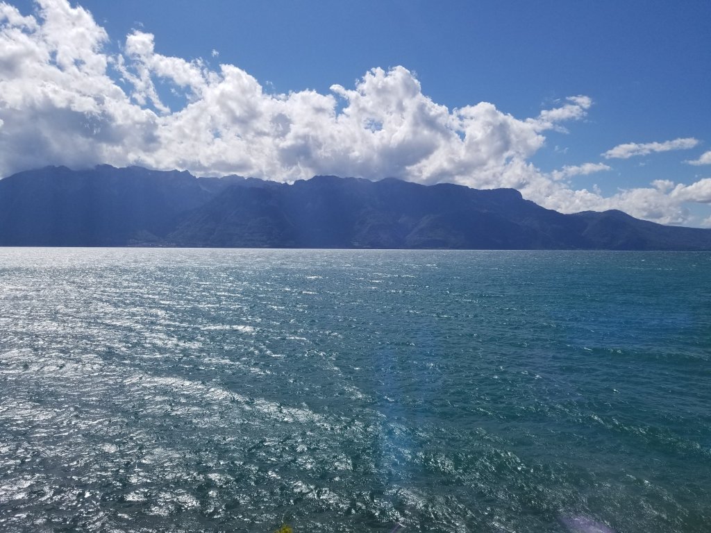 On the train I shove my stuffed rucksack in  storage then snag a window seat for the two hour ride to Geneva airport. Things are stable here on the train and I enjoy the feeling of settling in. I eat half my sandwich and chips whilst gazing out the window at a scene of towering granitic mountains to my right, then suddenly I am at the water’s edge of Lac Leman with wind-swept white caps in turquoise water the same color as my shirt. In places the view of the lake is like an ocean, with water that leads all the way to the ends of your visual field meeting with the sky.