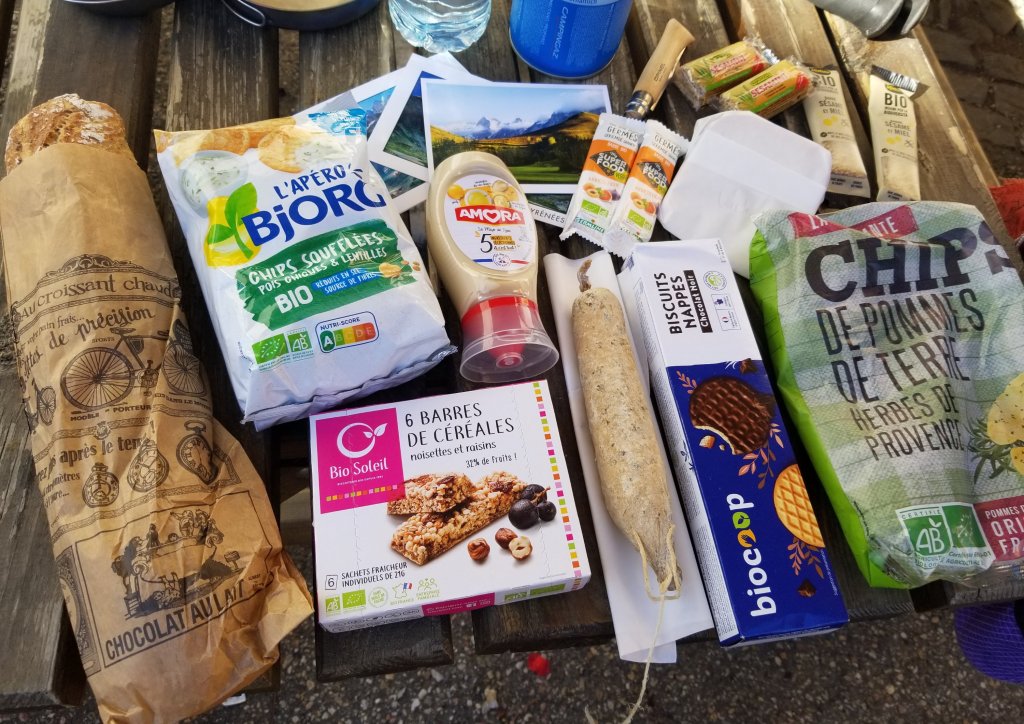 I purchase a canister of camping gaz, a baguette, saussison, cheese, a tube of mayo-mustard combo (nice find), a few post cards and a French made Opinel knife for cutting the food. These knives are typical here and are made in Savoie and are quite well known so I am actually excited to have one as a souvenir. I buy all that, and another bag of chips. I clearly have a thing for chips. My food bag is seriously heavy now. I better get hiker hunger fast!