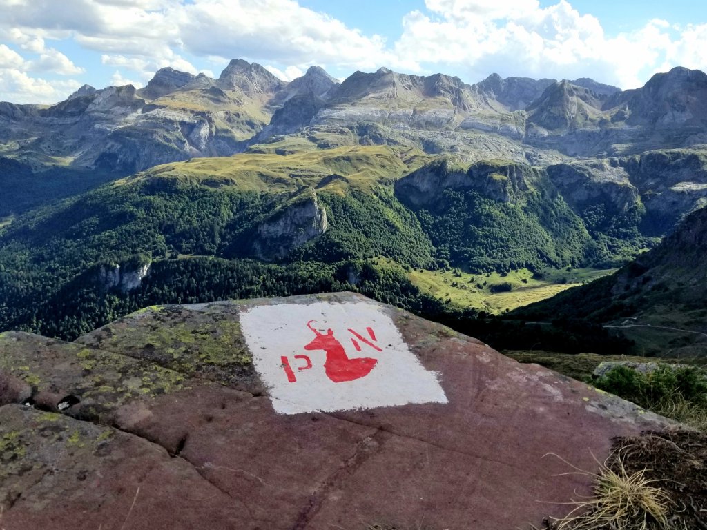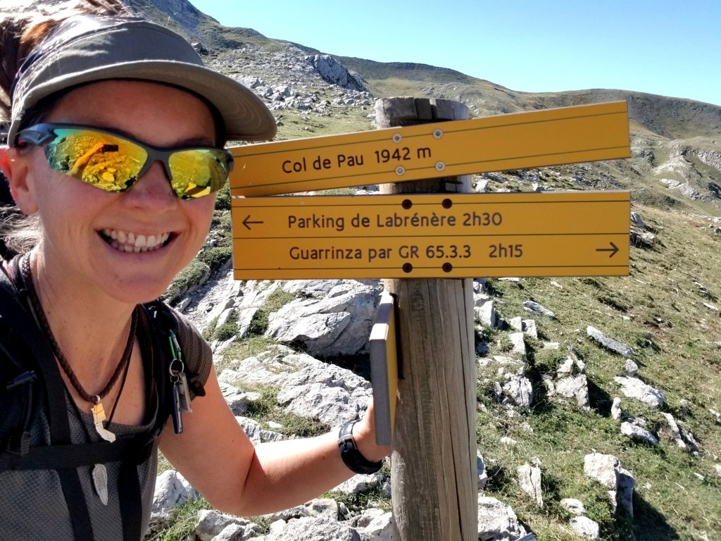 It’s not such a big dea reaching this Col, except there is a sign and several people there taking breaks. A woman asks me if I was the one down below in the tent. I do admit to this and try to chat in French telling her I’m hiking the Haute Route Pyrenees (HRP) for two weeks and today is my first day. I tell her I like to bivouac and she replies with “oh, congratulations” and laughter ensues because the limited overlap of languages between us is comical. Thus our conversation doesn’t go much further except we wish each other a Bon Journee! I snap a few photos at the Col and continue on and up, the climing ain’t over yet.