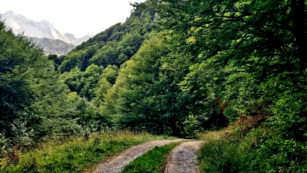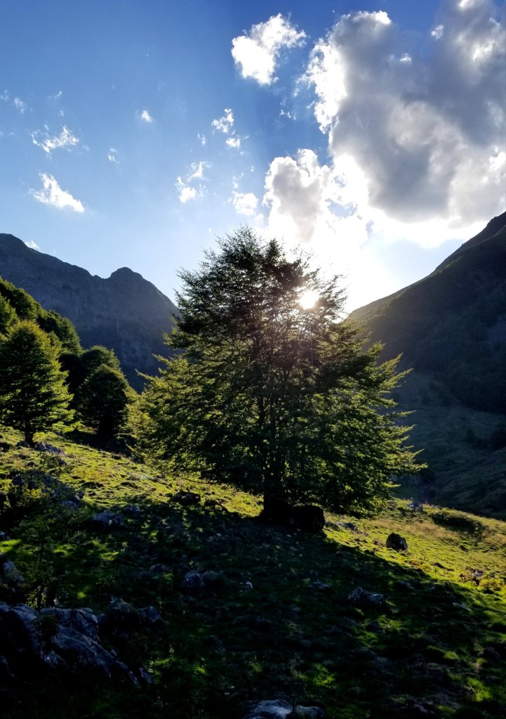 Hard to know but soon I am walking in a forest of giant Beech trees and the shade is lovely. The afternoon is deeping and the light is turning a rich golden color. I walk downhill for quite a long time and now my ankle is really hurting. It’s the one that alwas hurts. My upper back, neck and clavicles are also super sore. It’s the pack weight I’m sure, I’m not used to it. If I had to guess I’d say it weighs around 40lbs. There’s a lot of extra stuff I’m carrying here that I normally would’t have back home, things like extra paper maps, guidebook pages, extra electronics, chargers, charging adaptors, a small notebook, microspikes, and that darn extra stove!