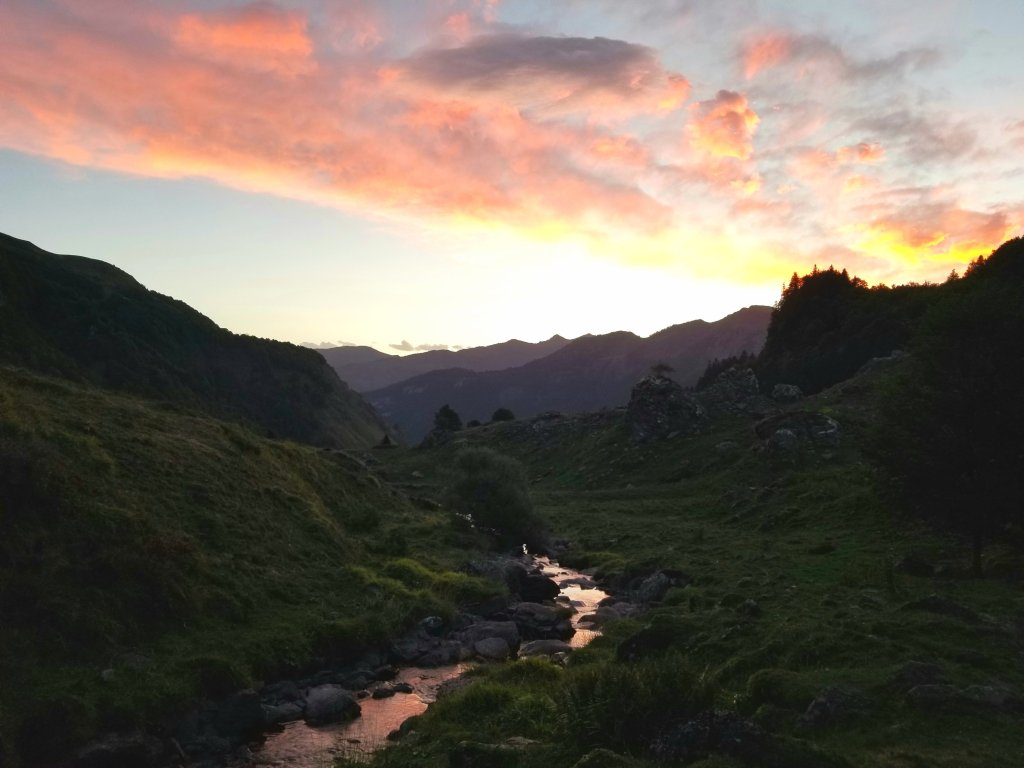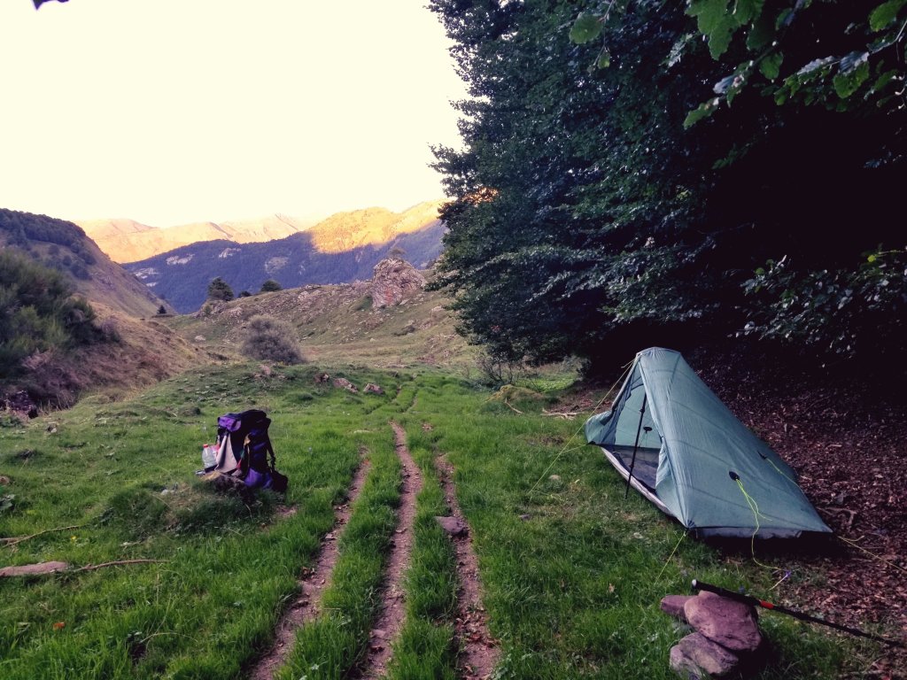 I walk around this area called the Pla d’Espelunguere looking for a prime five star campsite for around 30 minutes and eventually settle on the first one I had seen. Isn’t it always like that? I was hoping for something with a little more of a view, but honestly this spot suits me perfectly. I am close to running water, away from the dirt road, and tucked under a lovely Beech tree on a completely flat grassy spot. I even have a little dirt spot to set up my kitchen.
