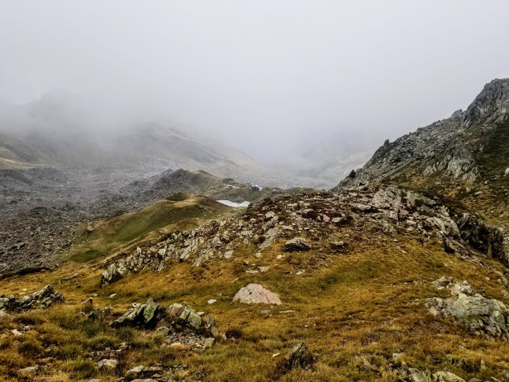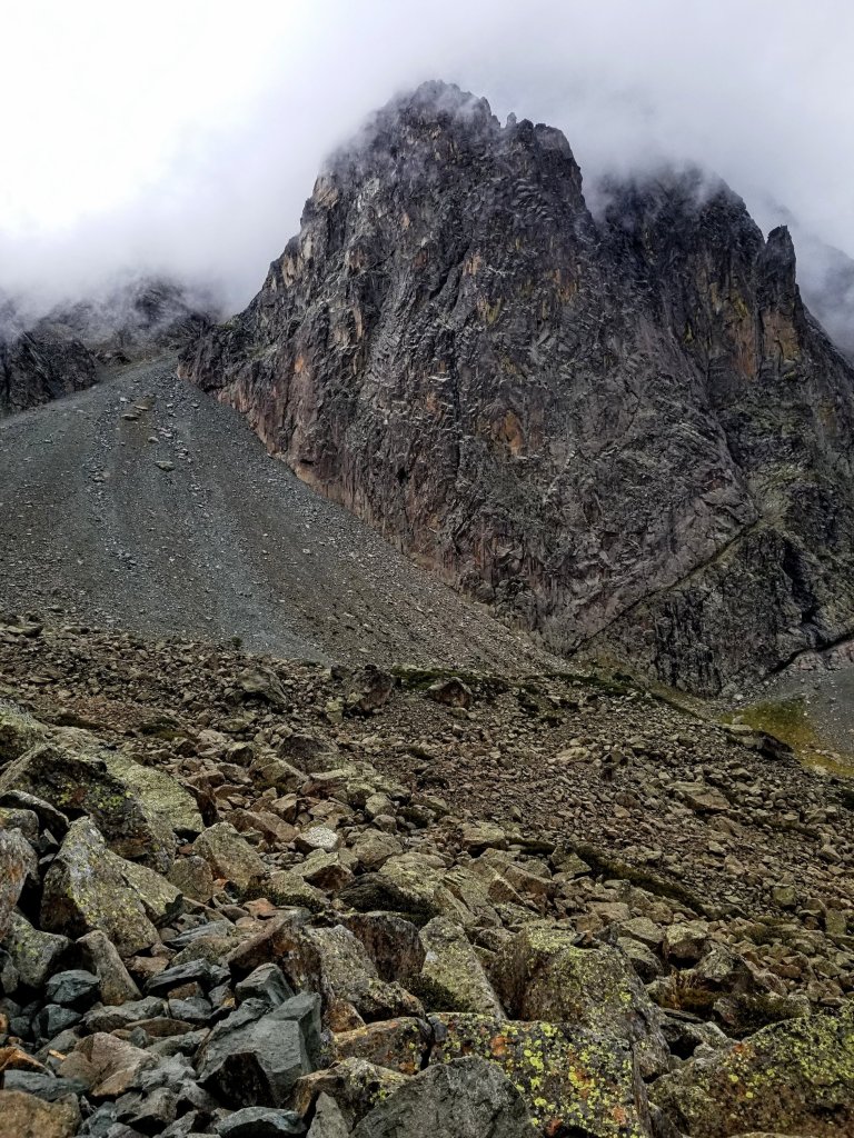 When I reach the Col there is a thick fog but I can see far enough for the path I need to take, thank goodness, so I keep moving. It’s right about now I am thinking how I seem to keep getting myself into these situations. This is super intense. Crazy pants. I don’t feel scared anymore now that I’m over the pass, but honestly, if this is how hiking was all the time I would never do it. Part way down the wind calms just a little and I duck behind another rock to check my location on my GPS. I am just a wee bit off route, not surprised with the thick fog, looks like I need to backtrack. Glad I checked. There are so many little trails out here, some are legit footpaths and others are animal trails. Often times I am on the correct trail and there are two paths side by side. Super confusing in good visibility, really bad now.