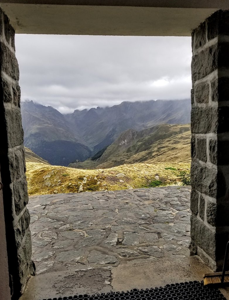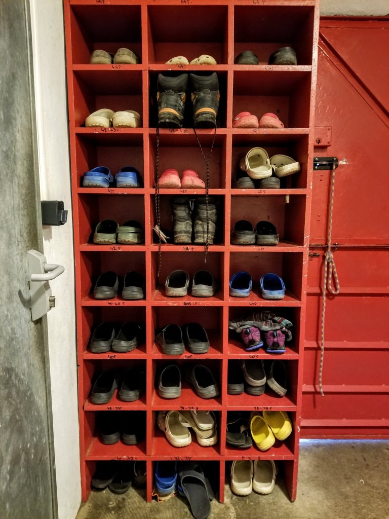When I walk into the entryway of the building my mind is so busy with expectation and curiousity. I’ve never stayed in a refuge before, what will it be like? I expect to be greeted with a host of hikers, instead I walk into a dark, dank room. I peek around and there are a few people sitting in a small side room at a table. Fortunately they speak a little English and let me know what to do and show me how to turn on a light. I am to leave all my wet gear hanging outside, then take off my shoes and there are sandals (crocs) provided in the entryway. Sweet, dry feet!