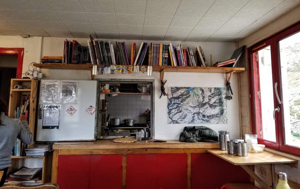 The time seems to draw on slowly today and as I sit by the window at the table writing and watch as the weather changes outside. It’s a writers dream. There will be brief periods of sun, then more wind and more rain. The mist and fog are a constant and the views of the Pic du Midi come and go. I meander into the dining hall and find a place to charge my electronics. This is a score indeed, was not expecting this. There are books lining the shelves with all kinds of information about the mountains and things you can do in them. The Pic du Midi is a very popular rock climing wall and there are a ton of routes. So fascinating.