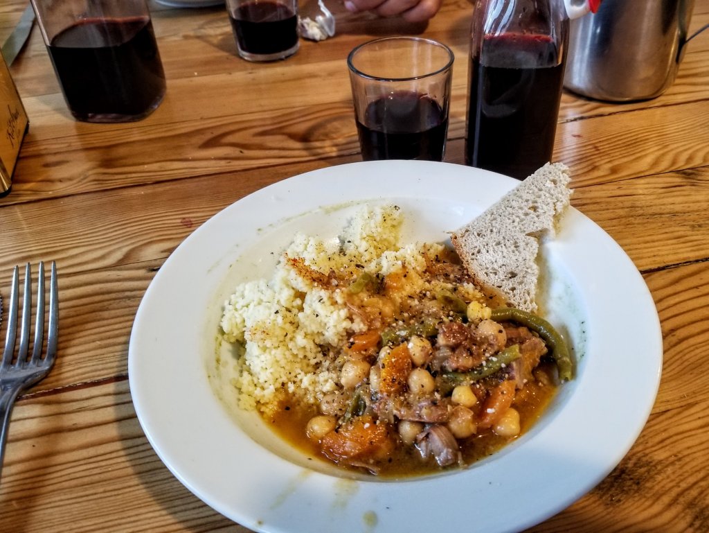By 19:00 dinner is being served and the room is fairly full with about 20 people. The first course is a green soup, I would have expected split pea by the looks of it, but it’s more like a spinach vegetable puree and is delicious and light. The second course is couscous with what looks likee rye seeds in it, along with a medley of vegetables, chickpeas and stewed pork in a light broth. I am not sure at first whether it is lamb, so I go light on the meat, but when I taste it, it is absolutely delicious. They seasoned it with some cumin and cardamon too and that makes it even better. I order a small red wine to compliment my meal and figure why not go for the entire experience? Apparently I am also having breakfast here which will be at 07:30. Why not!