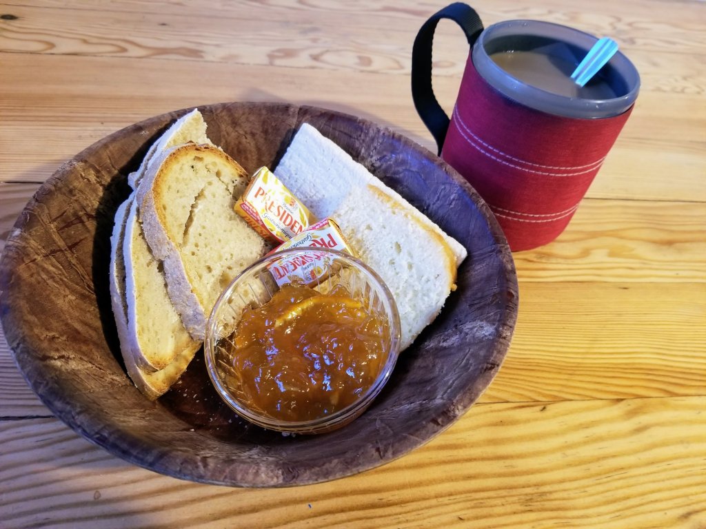 Soon I hear we need to exit the dormitory by 8:00am and that’s in five minutes, so I interrupt my petit dejuner to pack up my belongings hastily. When I return to the dining table I sit and enjoy my meal for about 10 minutes when I learn we need to exit this room now too. The guardians have a lot of work to do. I pack up my marmalade into a plastic baggie in true hiker trash fashion, butter the rest of my bread and grab everything and go sit on the front porch, trying to stay out of the frigid wind. As people pass by me with their packs loaded they smile at me awkwardly. I guess people don’t normally eat their breakfast this way.