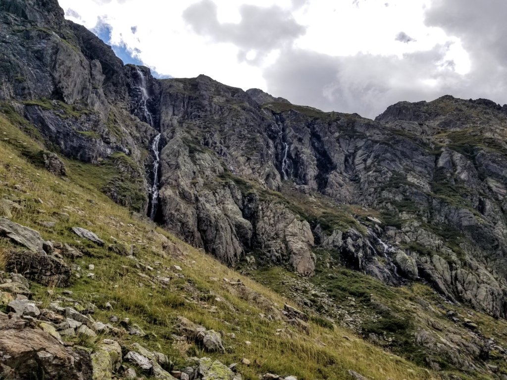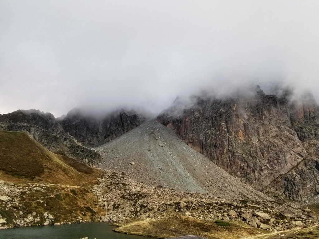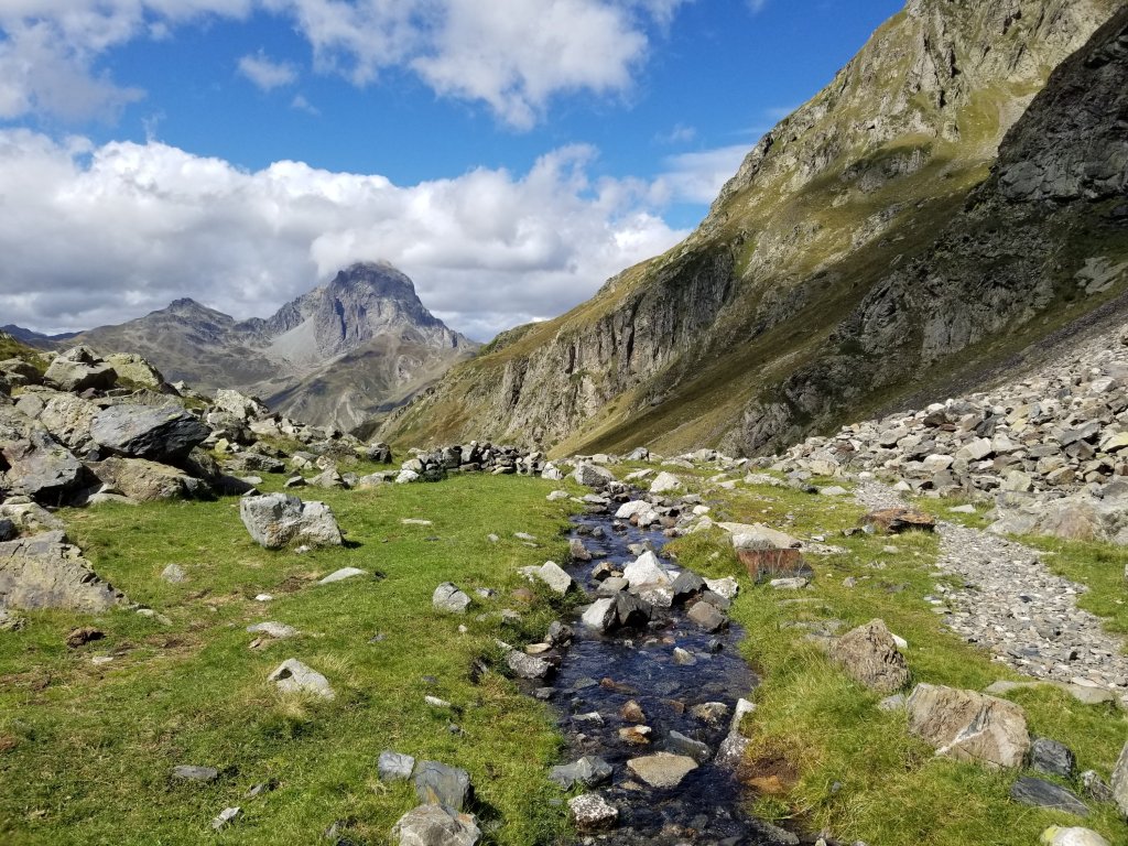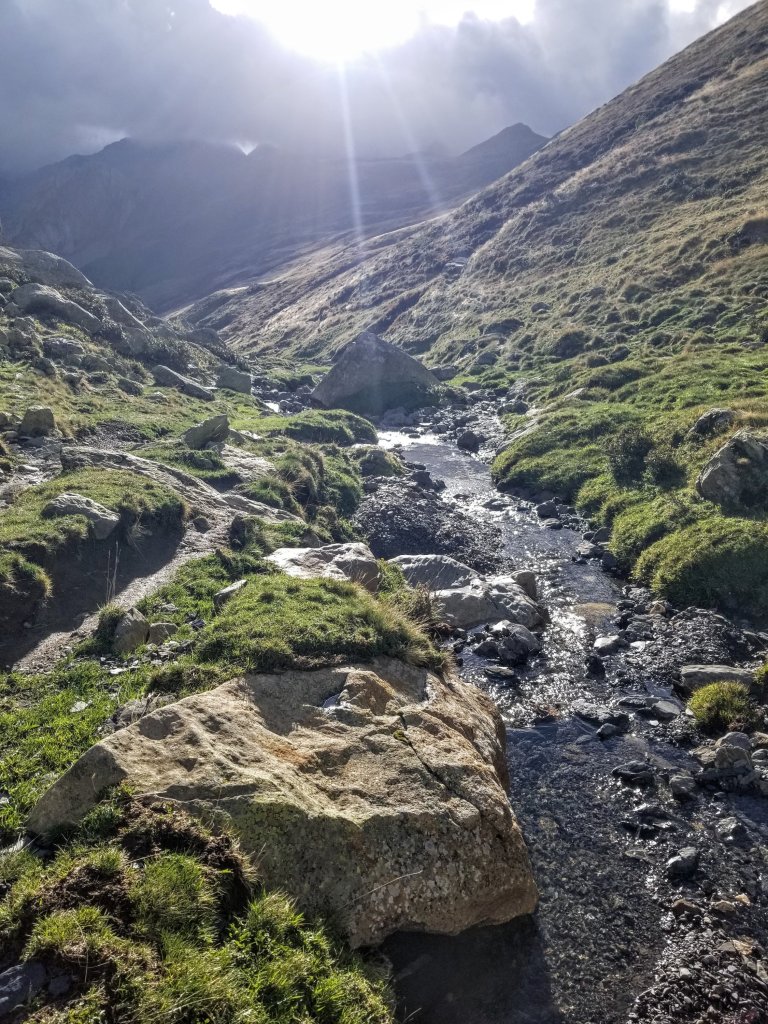 10:00am. The whole morning has been beautiful and the walk quite memorable with the way the sun is breaking through the clouds and then hiding again. Also, it’s not raining, hooray! There are great clouds and mist swirling around the high peaks and when the sun breaks through it feels amazing. When the sunlight glistens on the trickling creek I feel so refreshed. The Pic du Midi is still enshrouded in mist and I think about Olivier every time I look back. I hope he has a safe and successful day of climbing up there.