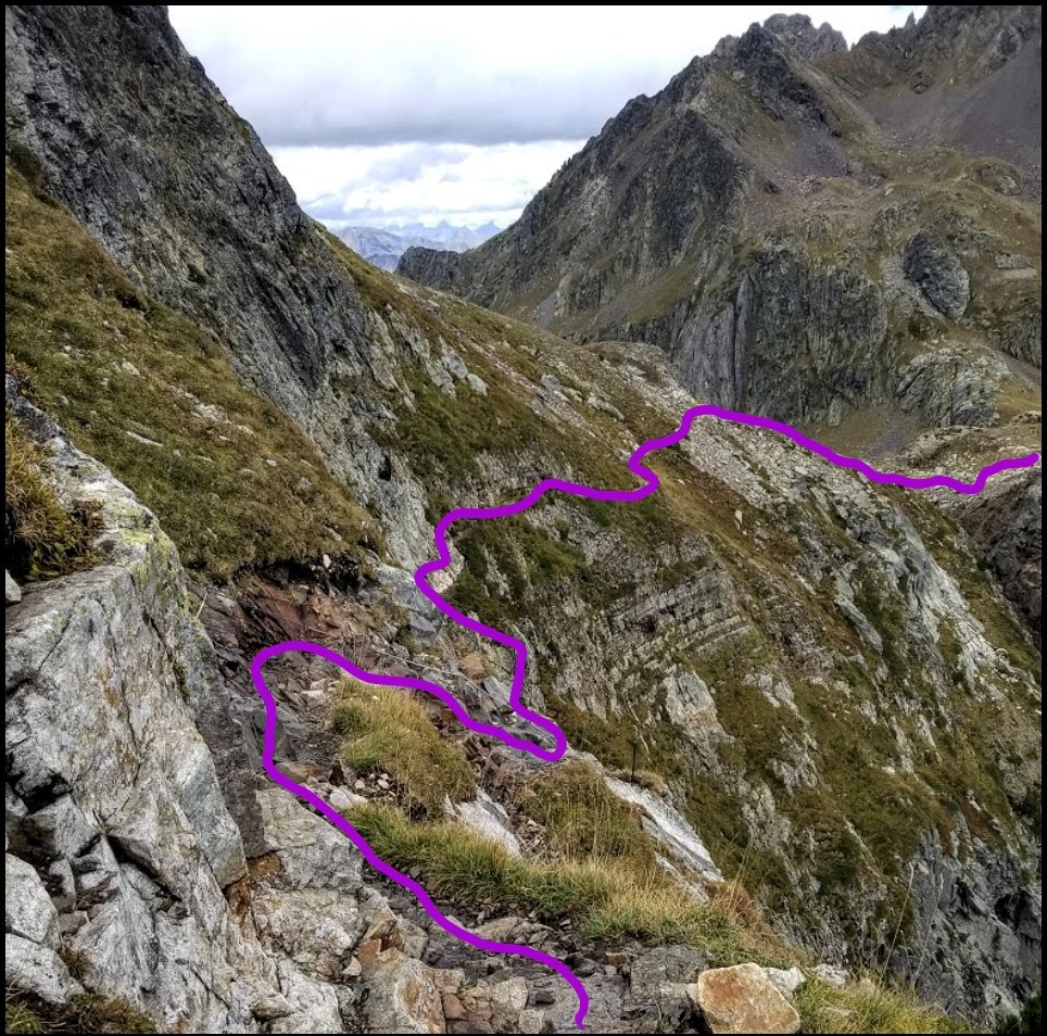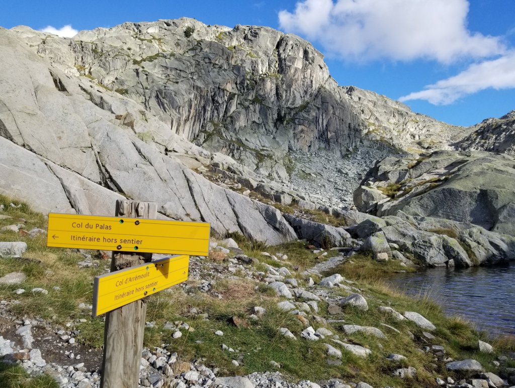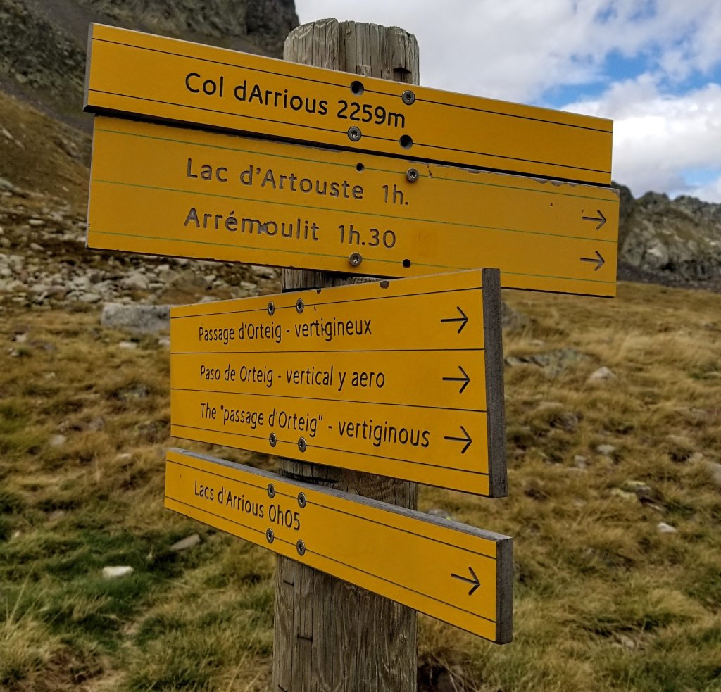 Soon, I am at the Col d’Arrious at 7,442ft (2259m). The girls are taking a snack break here and this is where one must choose between the infamous Passage d’Orteig or the Variant around Lac d’ Arrious. The Orteig is considered “vertigineux” and only to be taken on in good weather and when one is not afraid of heights or precipitous cliffs. It has a cable for safety and from the looks of the photos in my guideook it’s cool. I want to do it, and so decicde to go take a look. If it’s too much exposure or unsafe, I can simply turn back and take the Variant.