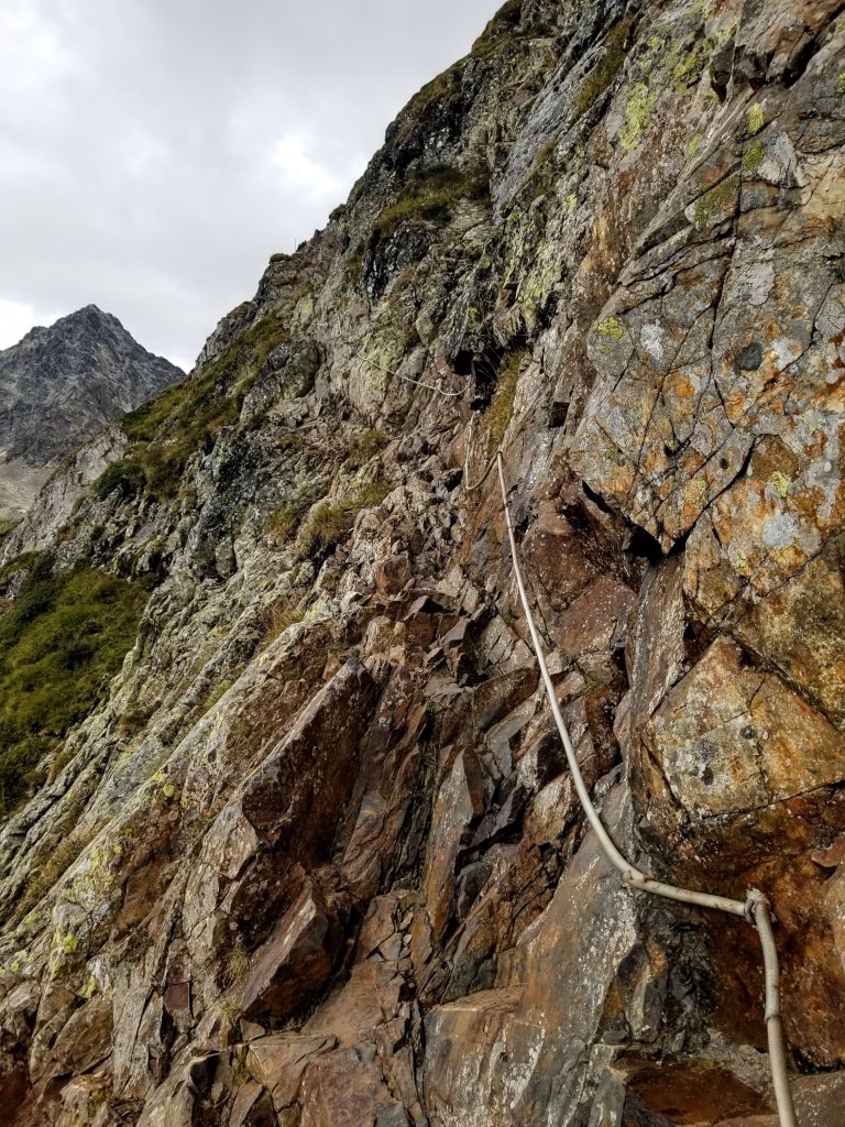 Throughout the planning for this hike, I’ve had a good feeling about this passage despite the description warning hikers to steer away from it in bad weather and describing it as “a steep climb above a deep abyss”. When I can finally see the cables and the sketchy route I feel very clearly that I can do it, but Ihope the rocks are dry. I am going to try it and now my adrenaline is pumping as there is pretty serious exposure, like a 2,000 ft drop off that you don’t want to be falling down. Hence the cables.