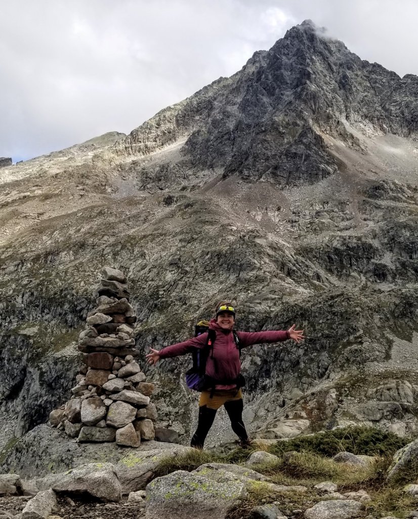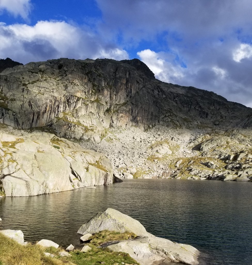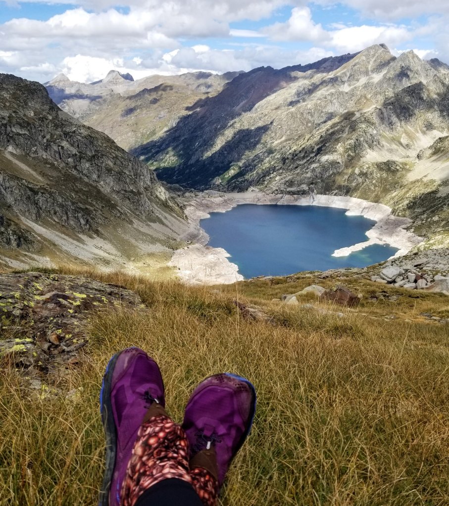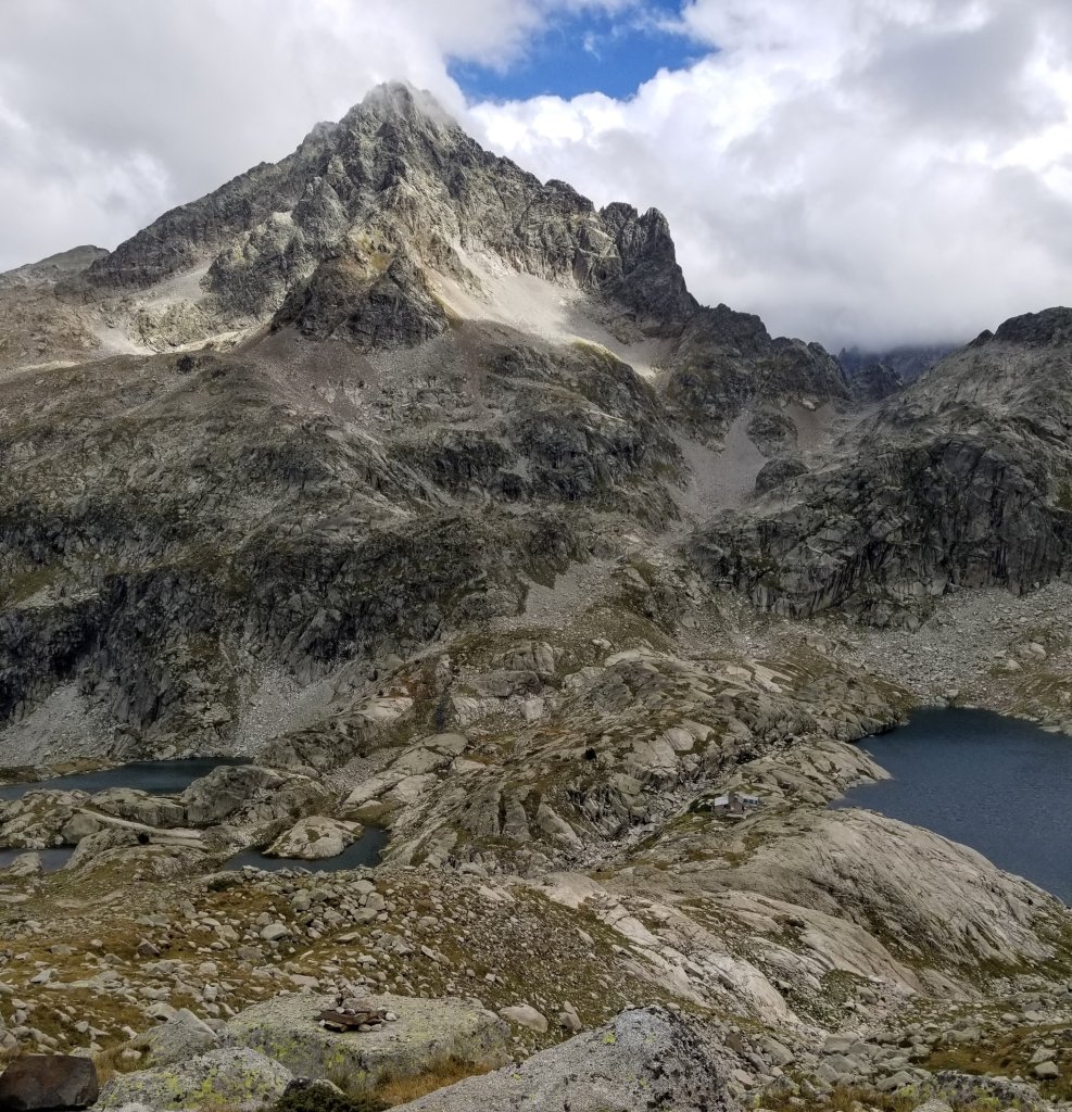 Onward and upward the trail now enters a beautiful stone cathedral of high peaks, lakes and mostly rock with a little grass here and there. It starts to remind me of the Sierra and I am loving it. I follow several rock cairns on the path now and stop at a viewpoint to have a snack of granola and take in the sweeping views. I am so close now to Refuge d’ Arremoulit that I simply don’t have to rush but the wind is picking up again and soon I’m chilled so I press on with curiousity and awe into the “wild rocky landscape” that my guidebok describes.