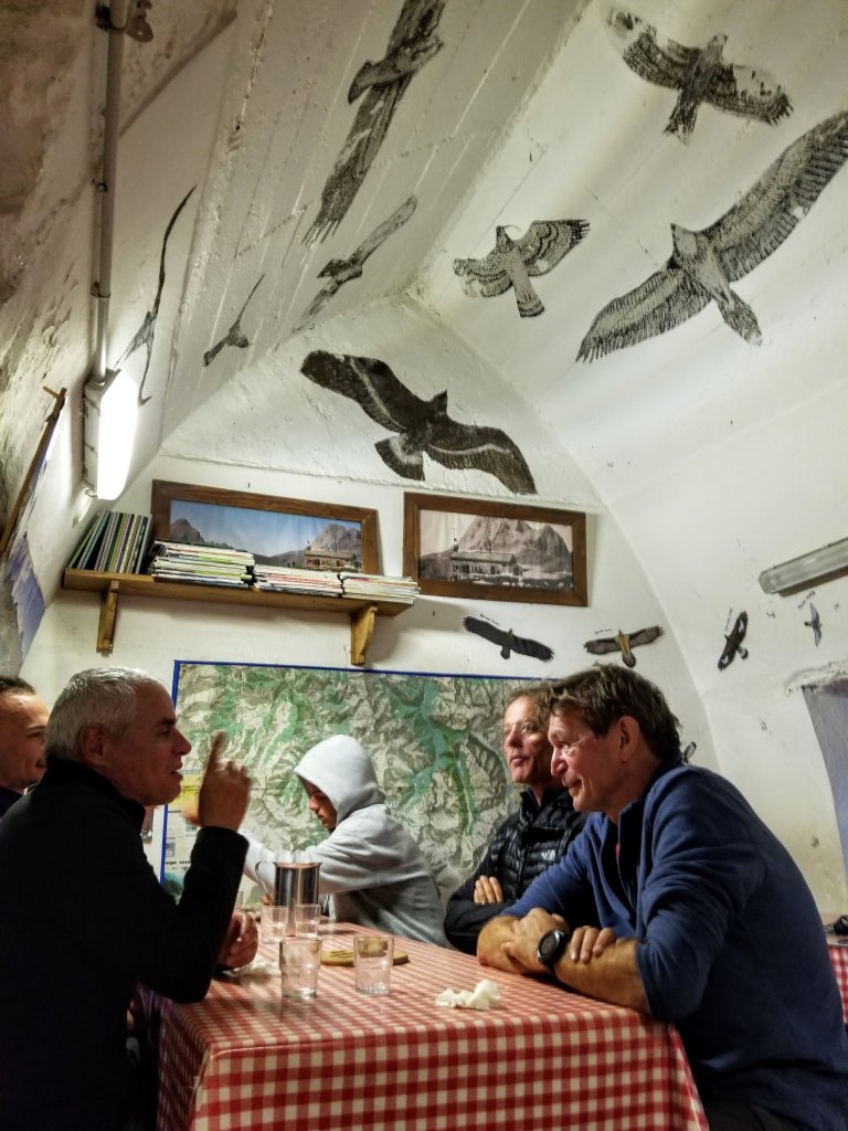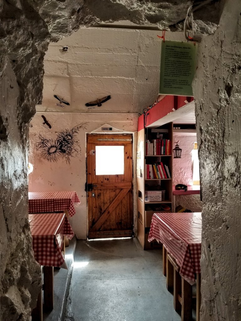 As I sip my tea and eat my snack a group of about 15 retirees wearing day packs shows up out of nowhere. Where did they come from? They make use of the picnic tables, mill about taking photos and within about 30 minutes, they vanish like apparitions. What just happened? Eventually the German girls, Sabina and Corina, show up and now I have some friends to chat with. Their English is really good even though they say it’s not. Nobody else here speaks English. When the guardian arrives I order myself a demi-pension which is a bed, dinner and breakfast. I am told I’ve got the last bed. I feel lucky since it is so windy and quite cold out there.