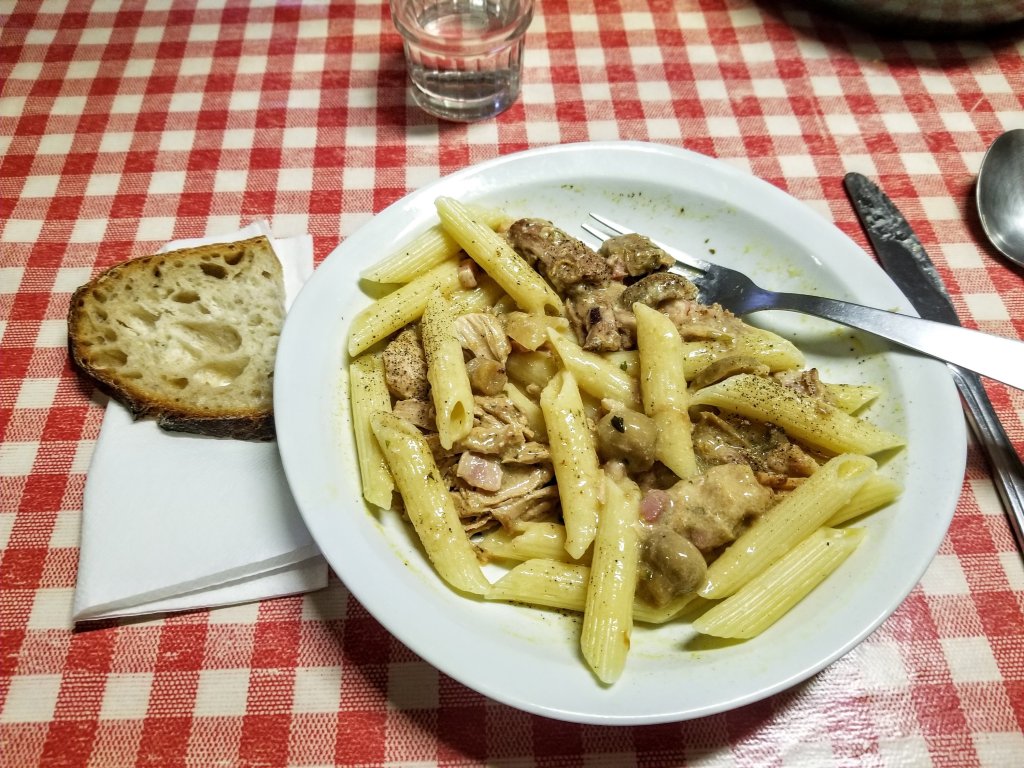 I’ve enjoyed myself so much I lost track of time. I head back to the Refuge as they are just about to start serving dinner. My name is on a list at a table with five others, and I take my place. We are served soup that is a combination of chicken noodle and split pea broth. It’s yellow, light, thin, has just a few vegetables and to my delight there are a few chunks of ginger. Yes! My stomach has not been feeling well this afternoon so that really hit home. The main course is penne pasta with a ragout of pork (I think) and mushrooms, like a gravy. It’s okay, not my favorite, not as good as last night. However, this Refuge is super small and in a very remote location, everything gets flown in by helicopter and there is just one guardian. He actually talks for several minutes about he ecological impact of the Refuges here in the Pyrenees, I wish I understood more of what he says.