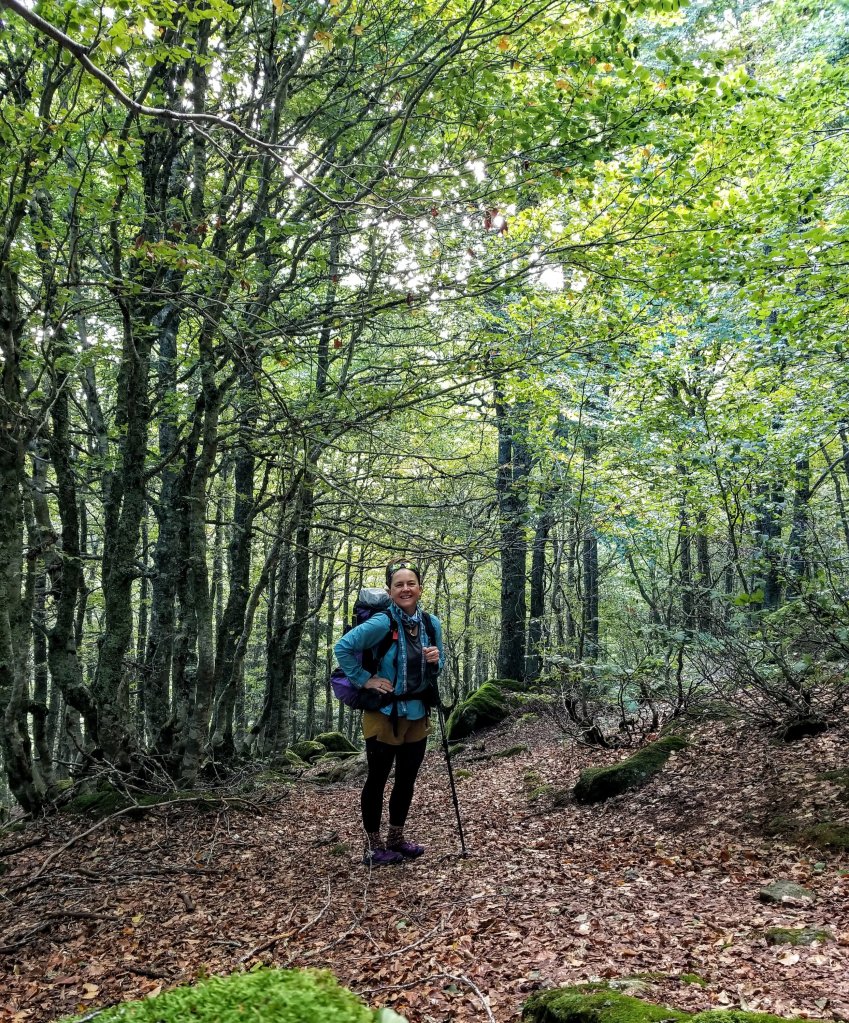 Shortly I drop to a road that has a trailhead for the National Park area trails. What I’m learning is that the National Parks are also used as pastoral lands for grazing animals. So different than back home. At the roadside, there is also a vendor who sells cheese. I am tempted but I don’t need the extra weight so I decide to pass on it. I bet it’s good though. I throw away my trash and dodge a very large horse standing in the middle of the road I’m crossing. It’s a brief little encounter with people, animals and cars and then I am in the forest again.