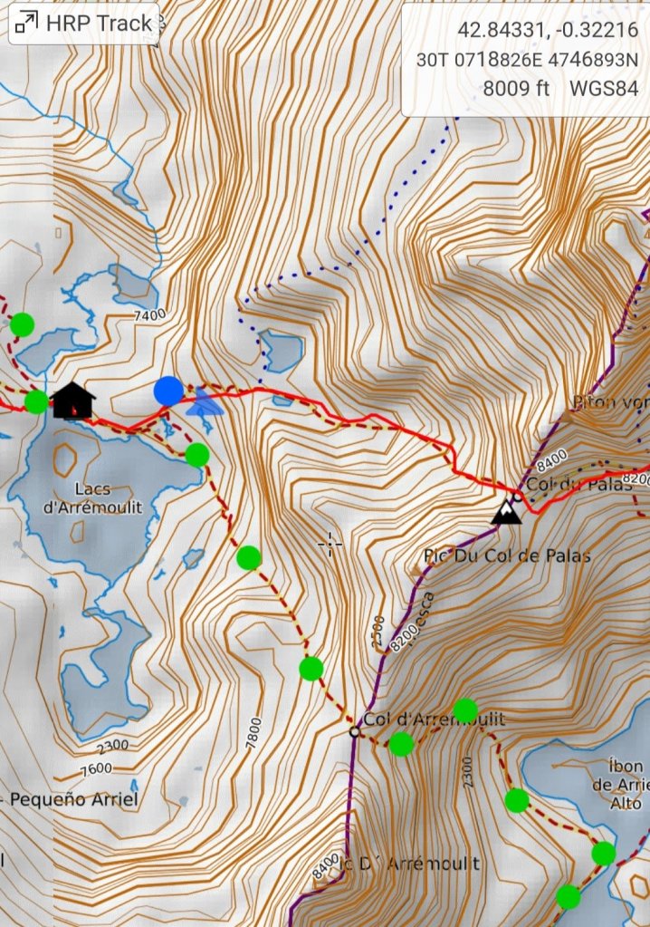From high up above I spy the Refuge situated on a precipitous waterfall at the outflow of the Lake d’Arremoulit. In the backdrop are the two Col’s, one of which I will travel over tomorrow. I am hoping to continue to the Refuge Larribet, which means I take the Col du Palas and the Port du Lavedan. This area sounds like some good cross country travel through steep talus with sweeping views and no route markings whatsoever, so good map and compass is necessary. The guidebook describes this route as a “more serious challenge” and says “in poor visibility the best thing to do is stay at the Refuge d’Arremoulit. Good visibility is vital for the final section to Larribet”.