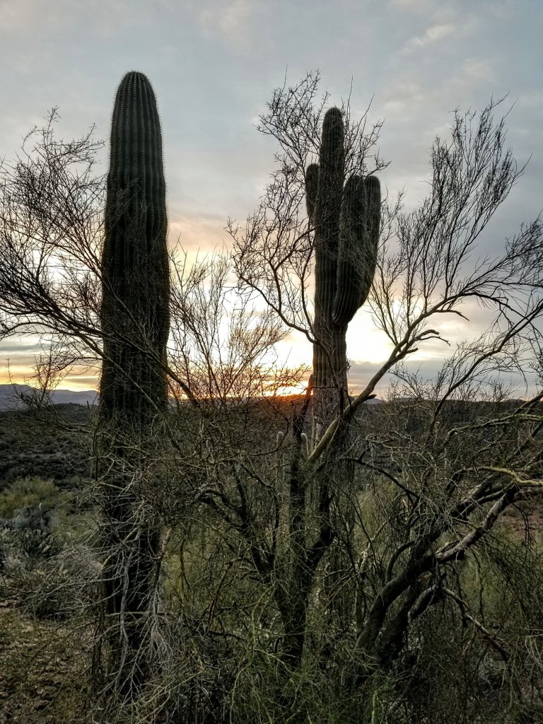 It remains cold as I walk and I keep all my layers on for quite a while. Apparently I did all the climbing there was to do last night as the trail now just winds through the Saguaros on a steady contour. There are now barrel cacti, ocotillo and mesquite trees and it seems as if this section would be really beautiful in the daylight, though walking along now in the dark of early morning there is a sense of great expansiveness that is unique to the wide open desert. The sky above me looms so large and I feel like a teeny tiny speck on this great Earth.