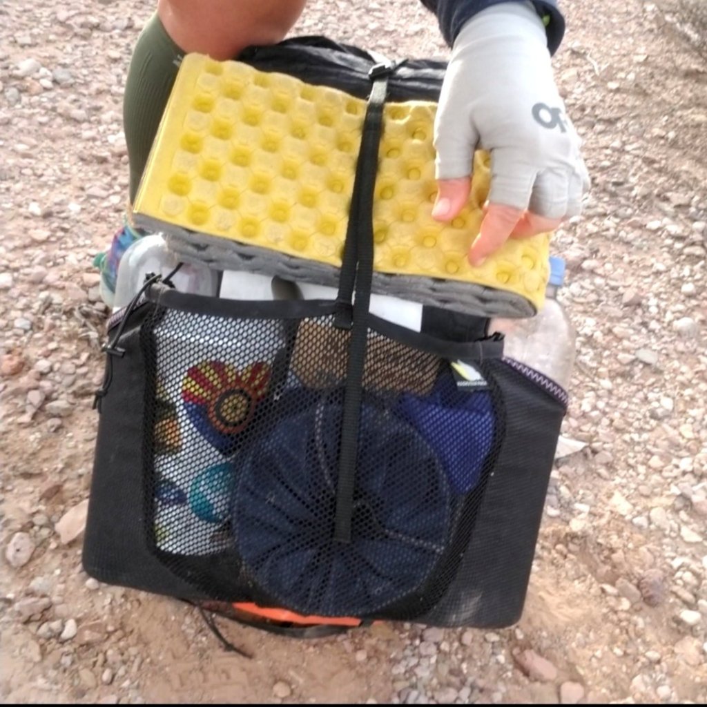 Outer mesh pocket storage: two smart water bottles, coffee cup, cook pot w/stove, spoon, back up battery pack, maps and sit pad