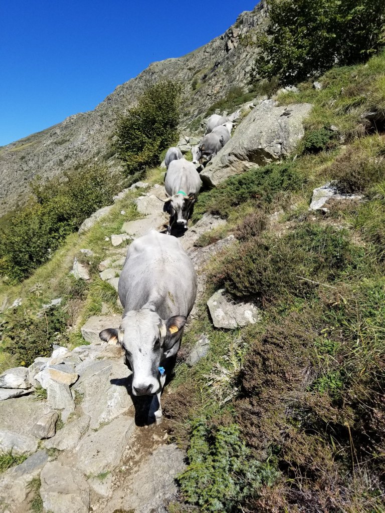 The climb is the typical steep climb that shoots straight up from the valley and there is a lot of cow shit on the trail, also typical. The trail is quite rocky and it is generally torn up from cow hooves. I hit several switchbacks and keep hearing some herders yelling and a cow is loudly moaning. I’m thinking maybe there is an injured cow. Or a cow giving birth perhpas? Soon my question is answered. The herders are simply driving a train of cows down the trail. Like 100 of them.