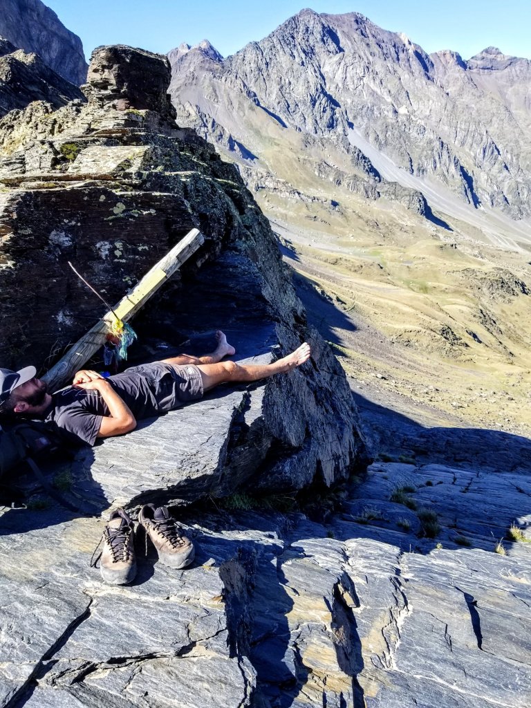 When I finally reach the pass I see a dude laying on the rocks, no shoes, hat over his face, apparently snoozing. When he hears me he apologizes for being in the way. I am taking photos of the pass and he just happens to be in it. I offer a sincere “no problem” cuz it’s really not a prolem, him laying there, he looks like legit hiker trash and I celebrate that! I’d originally planned on taking a break up here but now I want to leave him to his peace and so I decide to drop down a ways first.