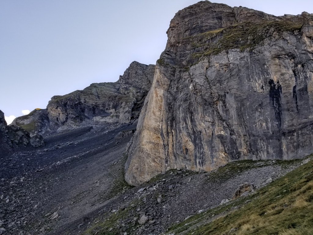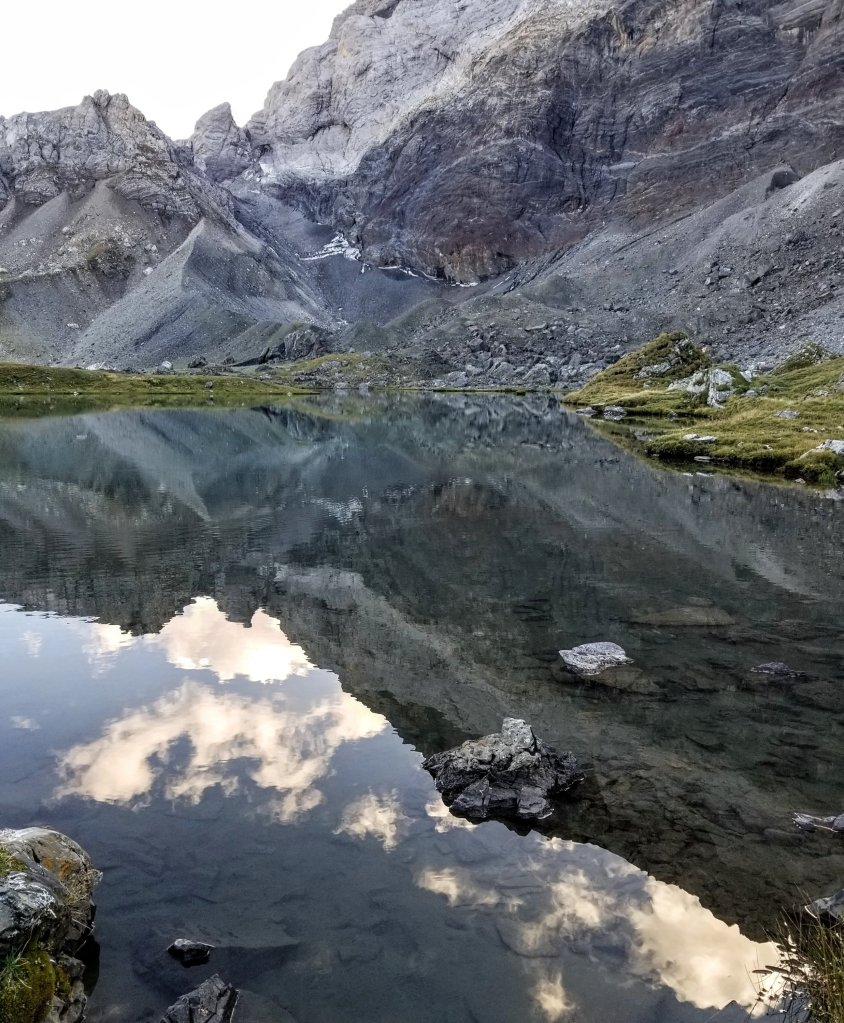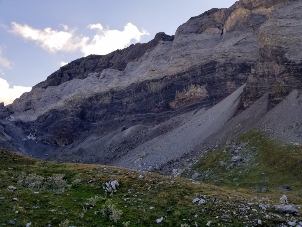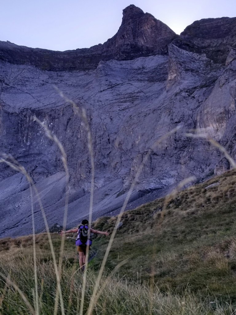 It leads me around a sweet little section of trail toward the Barroude Wall. As I round a bend the sunlight is glimmering on the long soft grasses. I pass through a smattering of sheep who graze along the hillside, then suddenly the wall is in view and I am smacked in the face by it’s presence. I am definitely impressed. I can only compare it to perhaps Evolution Basin in the Sierras, though not anywhere near as remarkable or large in scale, but this wall is giantic. It rises at least 1,000 ft from where I am walking and undulates with gorgeous curves and bowls that were clearly carved out by glaciation.