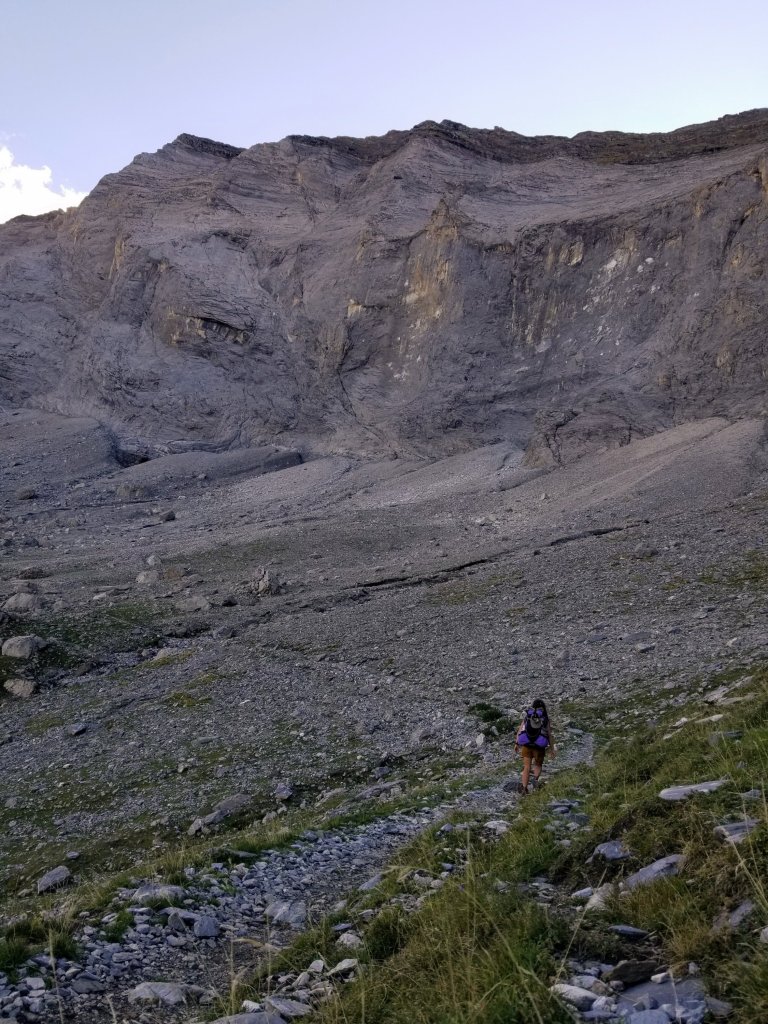 I backtrack along a series of steep switchbacks until I meet the trail junction that I’d missed. From here there is a very clear trail and I continue along the foot of that giant rock wall. It feels super cool to stand at it’s base and get to feel that massive energy up close and personal. Finally I have to make one last uphill push to another small gap, not quite a Horquette but enough of a climb that my legs are sure feeling it.