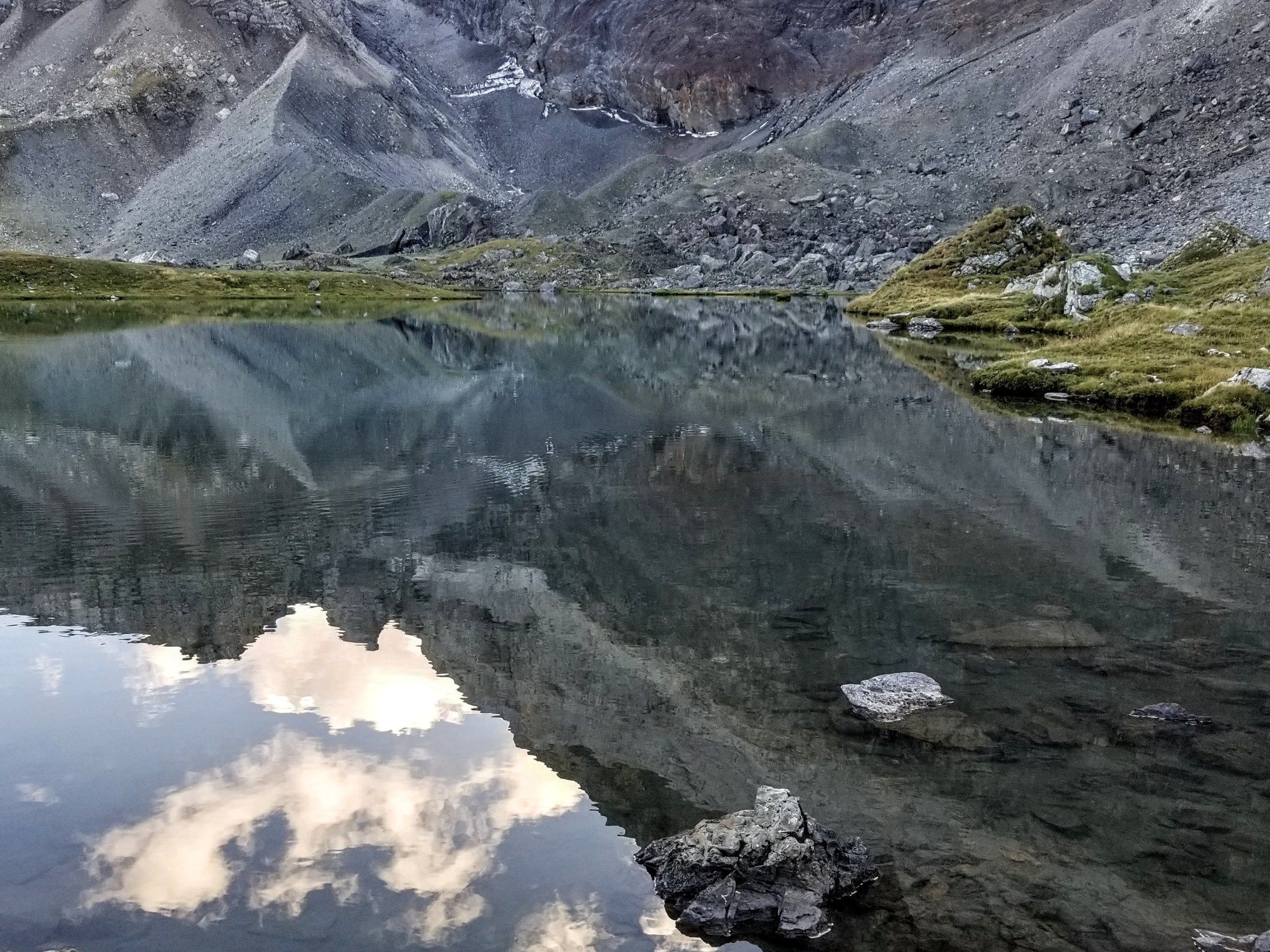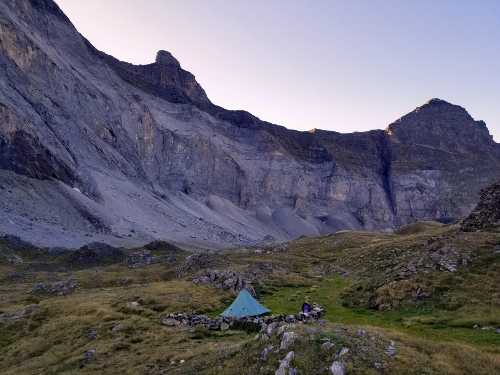 When I reach the Lac du Barroude at 7,785 ft (2373m) it is about 6:20pm and I need to collect water for the evening. I walk down to the lake and take in the beautiful scenery. In the distance I see two people walking but I never do see a tent. Otherwise, I have this place to myself. There is also a perfect bivouac site right near the trail so I go ahead and take that bird in the hand. It’s cold, already 45F now and I am glad to camp just a bit higher than the lake. I think it’s going to get cold tonight and I am already feeling chilled from sweat.
