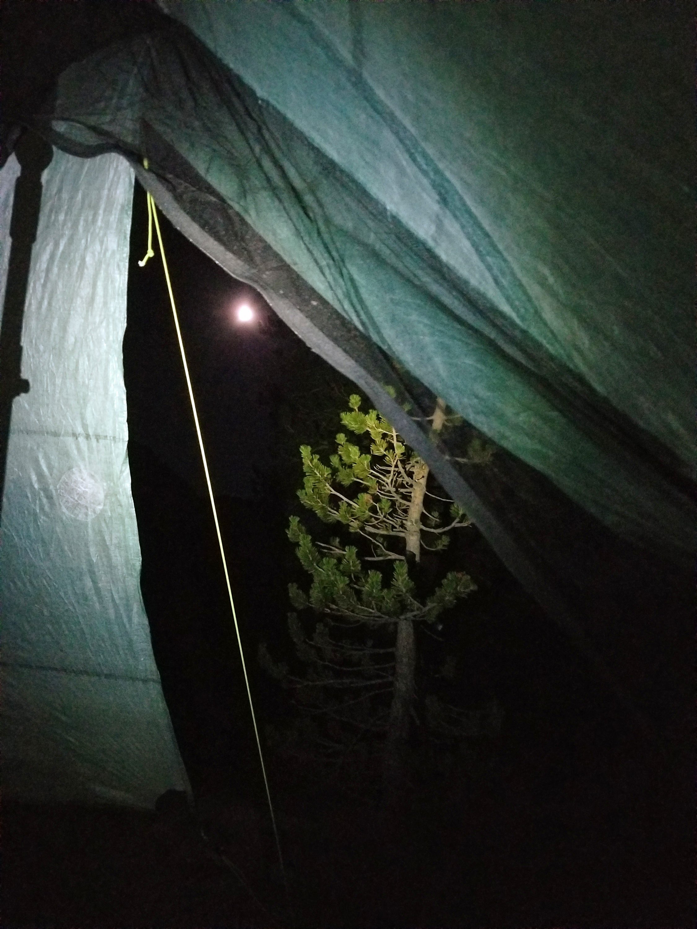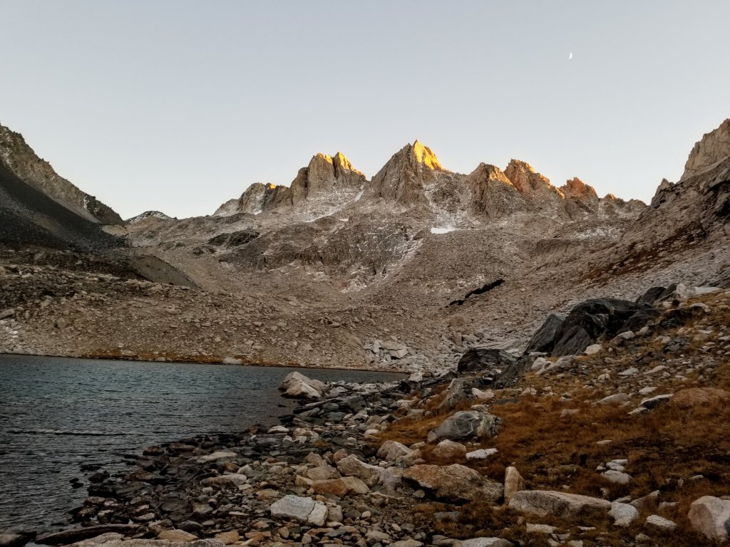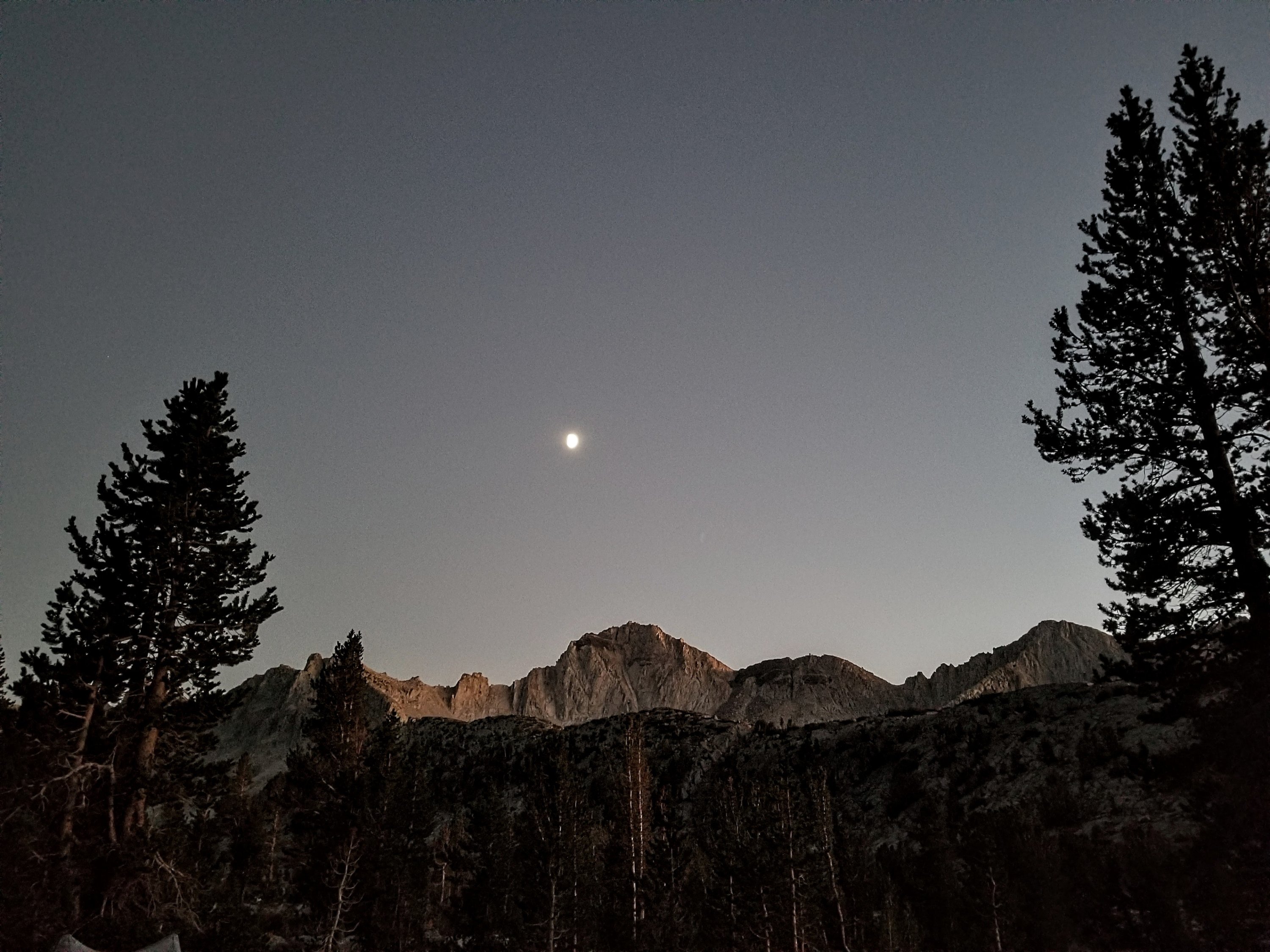 We drop a few miles and a thousand feet from the pass admiring the beauty of the lakes framed by the craggy granite peaks surrounding Dusy Basin. It is a magical place here indeed. The moon is just a little past half full and sits poised right above a pointed rock face we don’t have a name for.