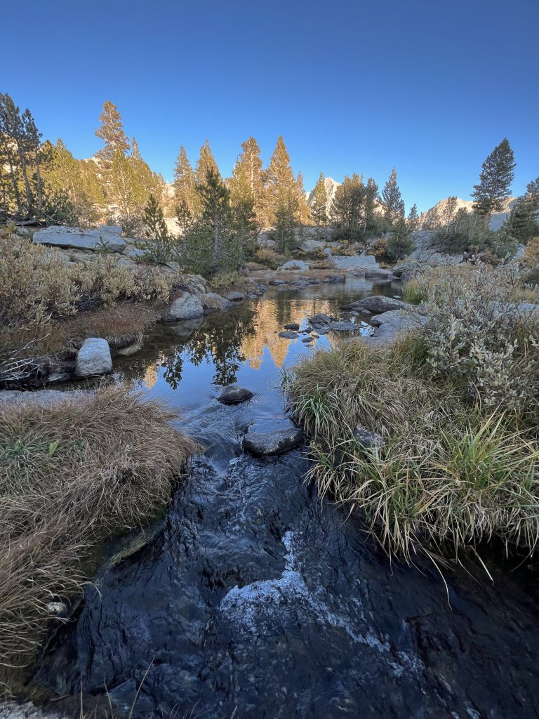 We make it to the outlet of the furthest lake in Dusy Basin, right before that water drops into Le Conte Canyon. We select a sweet little campsite that is actually close to a few other folks to our surprise, but they are not close enough to talk with. It is really still and quiet tonight, the trickle of water flowing from the lake outlet is just audible enough. There isn’t any wind except for a subtle occasional breeze stirring up the air, then settling back into stillness. The moonlight illuminates the craggy granite peaks, the stars have brilliantly popped out for the night and it’s dropped to 40F already.
