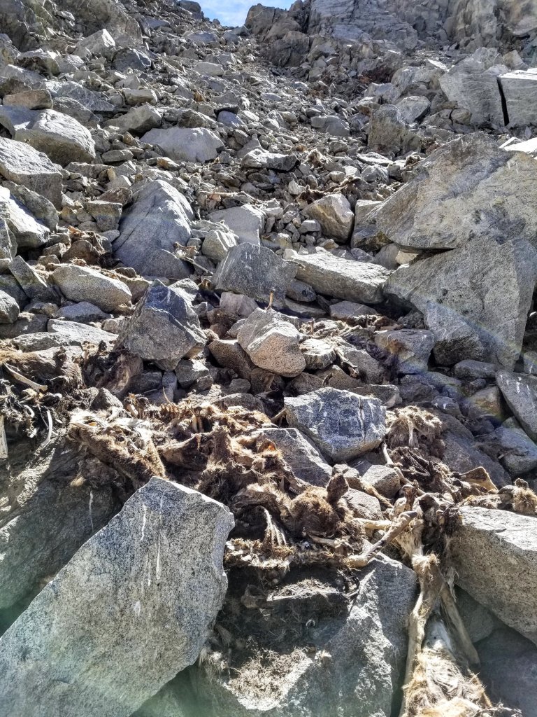 Hitting some tight switchbacks, we see the deer bones that remain from a massive rockslide that wiped out a hundred deer back in 2018. Rockin’ tells me the same thing happened on Shepherd’s Pass that same year, which I hadn’t known. It’s been interesting to ponder this whole thing, why there were so many deer all together there in the first place and how the timing worked out that they all got killed? From year to year, I’ve watched how the carcasses have decayed, been picked off and now they have nearly disappeared, leaving very little evidence but a few scattered vertebrae four years later.