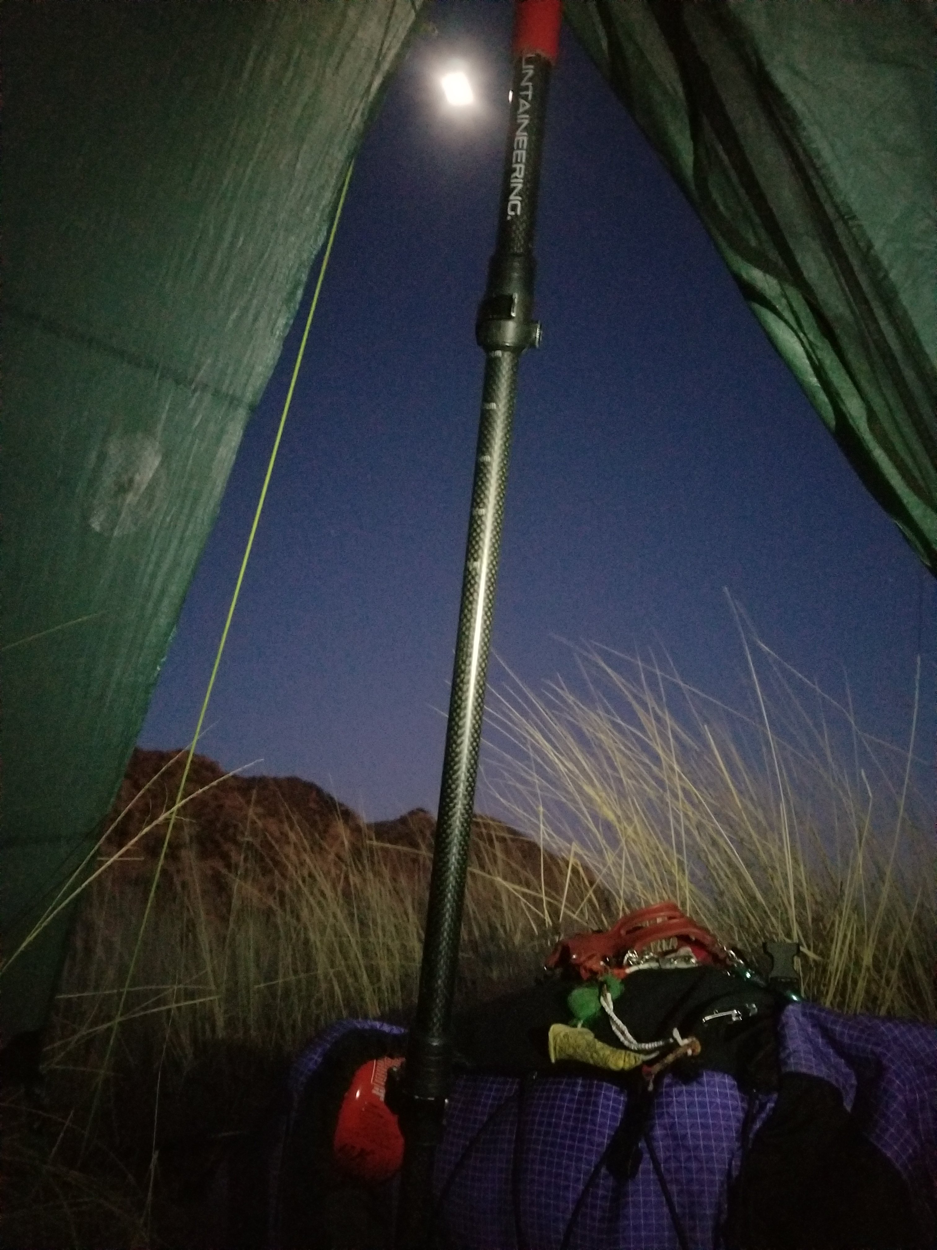 It is 40F inside my tent now and we expect temps to drop to the low 30’s tonight. The moon sits 3/4 full and high in the sky. The wind has died down and it has become a still night with the occasional sound of the wind gusting momentarily. It’s so wonderful to lay here and allow myself to imagine what adventure, surprises and beauty lie ahead. We have a perfect weather forecast for the week, and we heard from Nick it is absolutely beautiful up on that Mountain. I am so ready to do this!