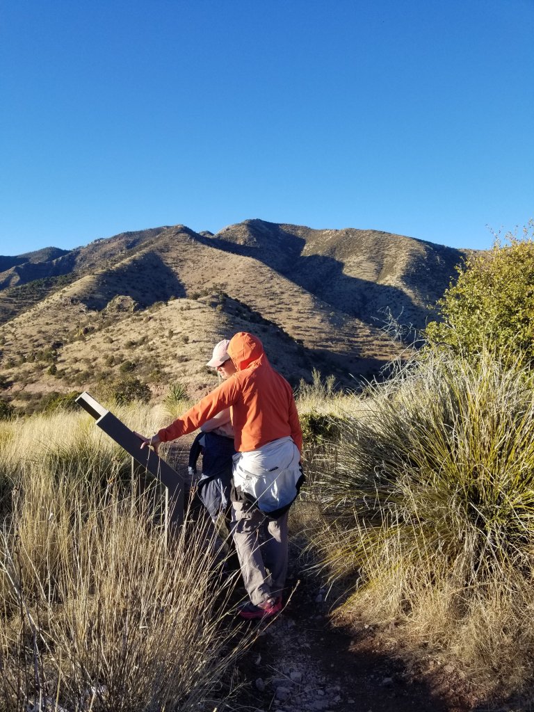 When we arrive at the Coronado National Memorial it is just around 3pm. We register my car to park at Montezuma Pass, purchase a small souvenir and use the restroom next to which we find our first trail magic! There is a small stash of hiker food lined up against the building containing: dog food, pop tarts, a jar of Skippy, a couple bars and drumroll…a giant bag of Peanut M & M’s! Such a score! Kristy snags the bag and we each supply ourselves with a handful. We figure between the three of us, we can make that bag disappear. And now we’re off to the Trail!