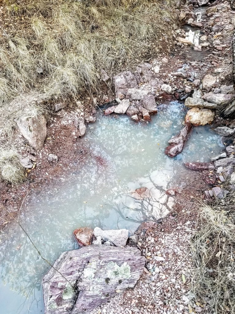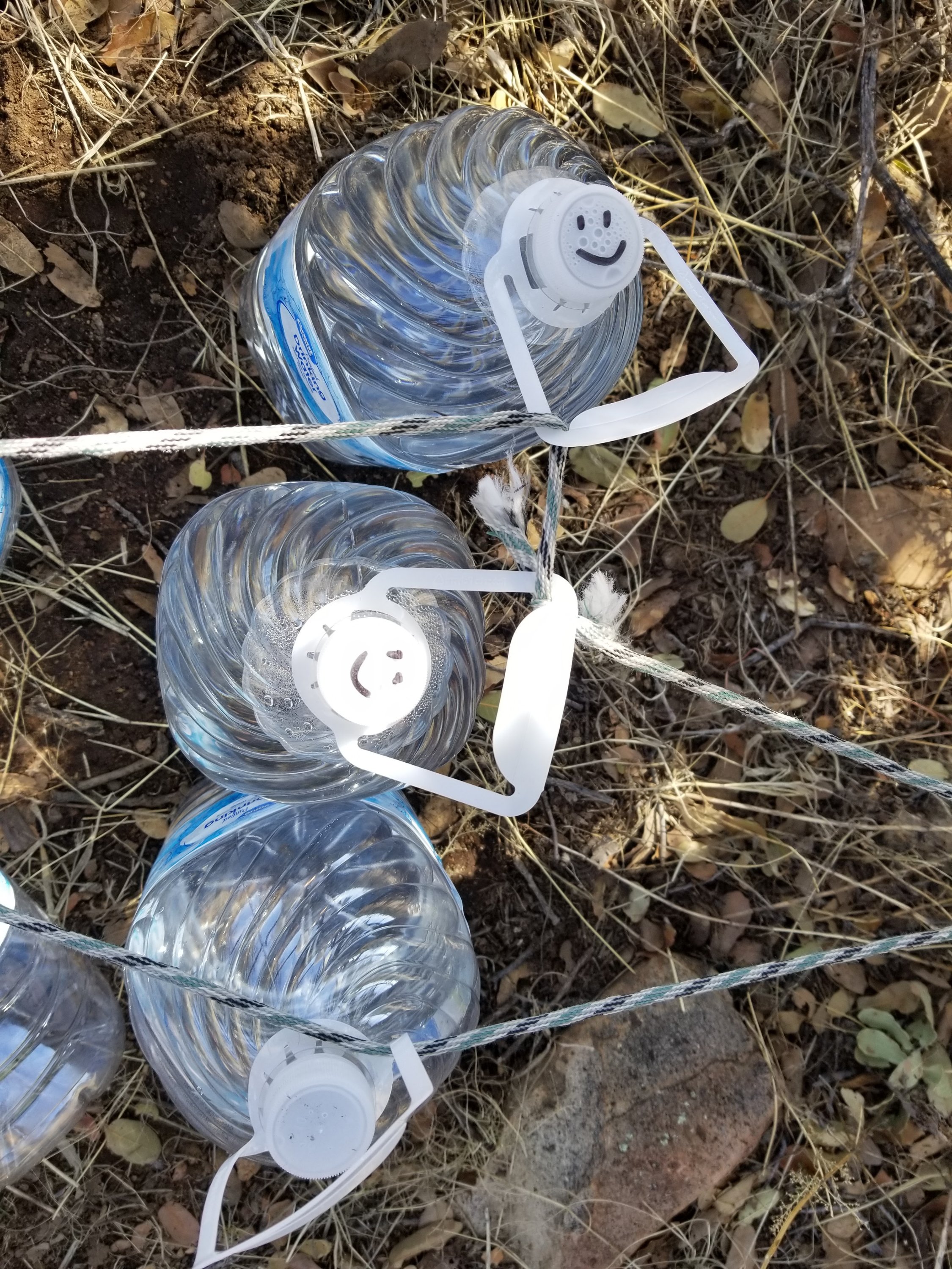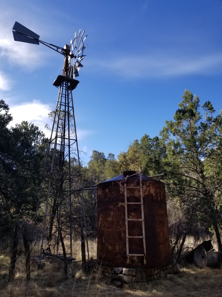 We pass an old windmill and then a gate with a water cache too. We each top off our bottles thanking whomever was thoughtful enough to place them there. Bottled water that does not have to be filtered is hiker gold out here!