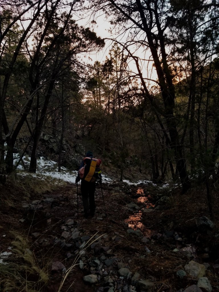 It’s 6:30am when we start walking and its barely light enough to switch off our headlamps. We start out on some crunchy thin ice and snow but it is basically gone now. There are wispy clouds above the forest canopy turning cotton candy pink and the color reflects on the ribbon like stream we are walking along. There has clearly been a lot of water rushing through here sometime recently as the creek bed is a mess and the trail gets lost frequently. It looks quite different as compared to 2019.