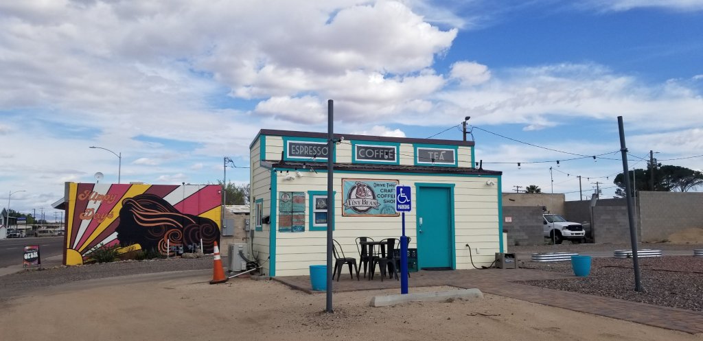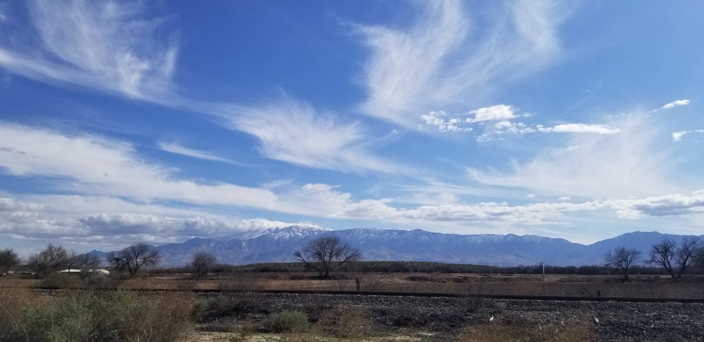 She directs me to a place called Tiny Bean in Safford and when we get there it is just a drive thru coffee hut. No seats or table, no Wifi. We sort of needed the Wifi. And, as we are driving in, we both could not help but notice the heaps of snow on the surrounding mountains. The exact mountains we are about to go hike into, the Pinalano’s which are home to Mount Graham at 10,724 ft. From down here it looks impassable.