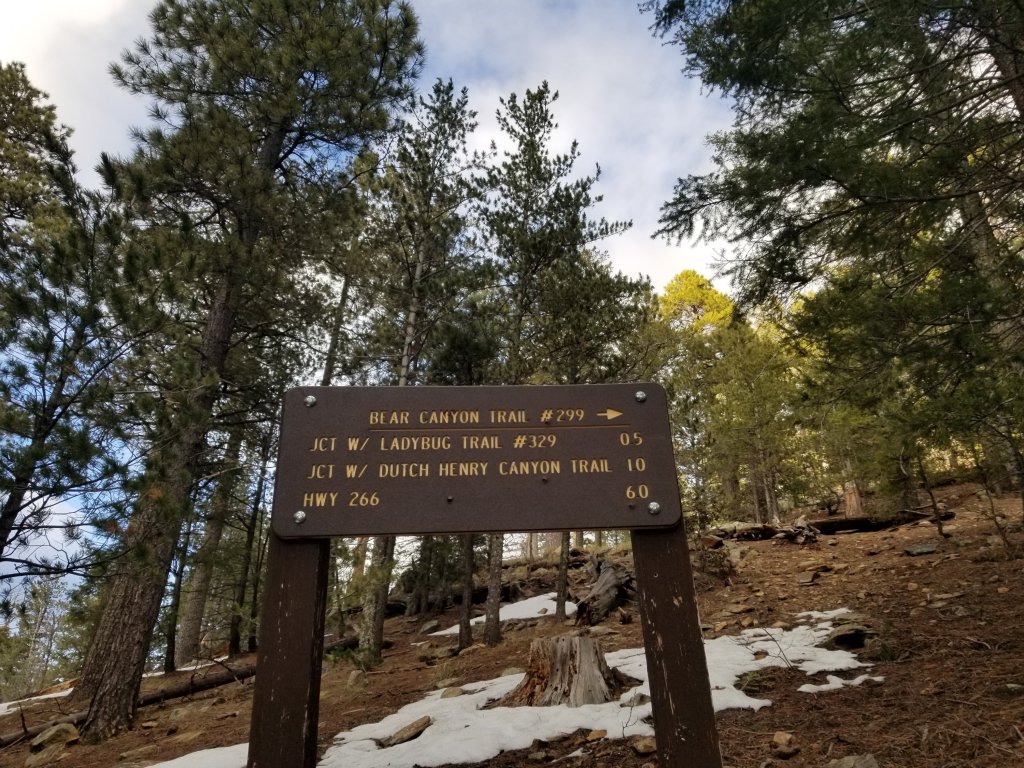 To our great surprise and joy, we find our trail is made of dirt! It seems that the aspect of these mountains does make a difference in how much snow there is. We glance over the South side and see it’s pretty clear of snow, so we decide are good to go on our start up to Ladybug Peak. But first we have to shuttle our cars, so we decide to drive down to Portal, AZ to a campground down there. It is going to take close to three hours. Long Day.