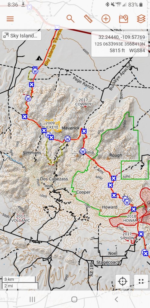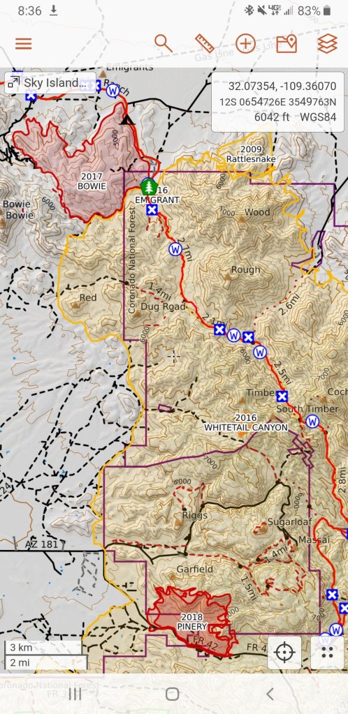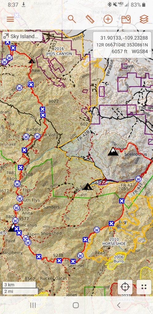 Planning and Resources: With about a week’s time to explore this route, Rockin and I decided to tackle the last two sections of the route, sections 7 & 8. The Sky Islands Traverse utilizes around 93 miles of the Arizona Trail, which we have both hiked, so we will be biting this off in chunks in the areas we have not explored. Sections 7 & 8 make up rougly 121 miles, from Ladybug Peak in the Pinalanos to Silver Peak in the Chiricahuas and includes the Dos Cabezas Wilderness, Fort Bowie, Emigrant Canyon, Cochise Head and skirts the Chiricahua National Monument.