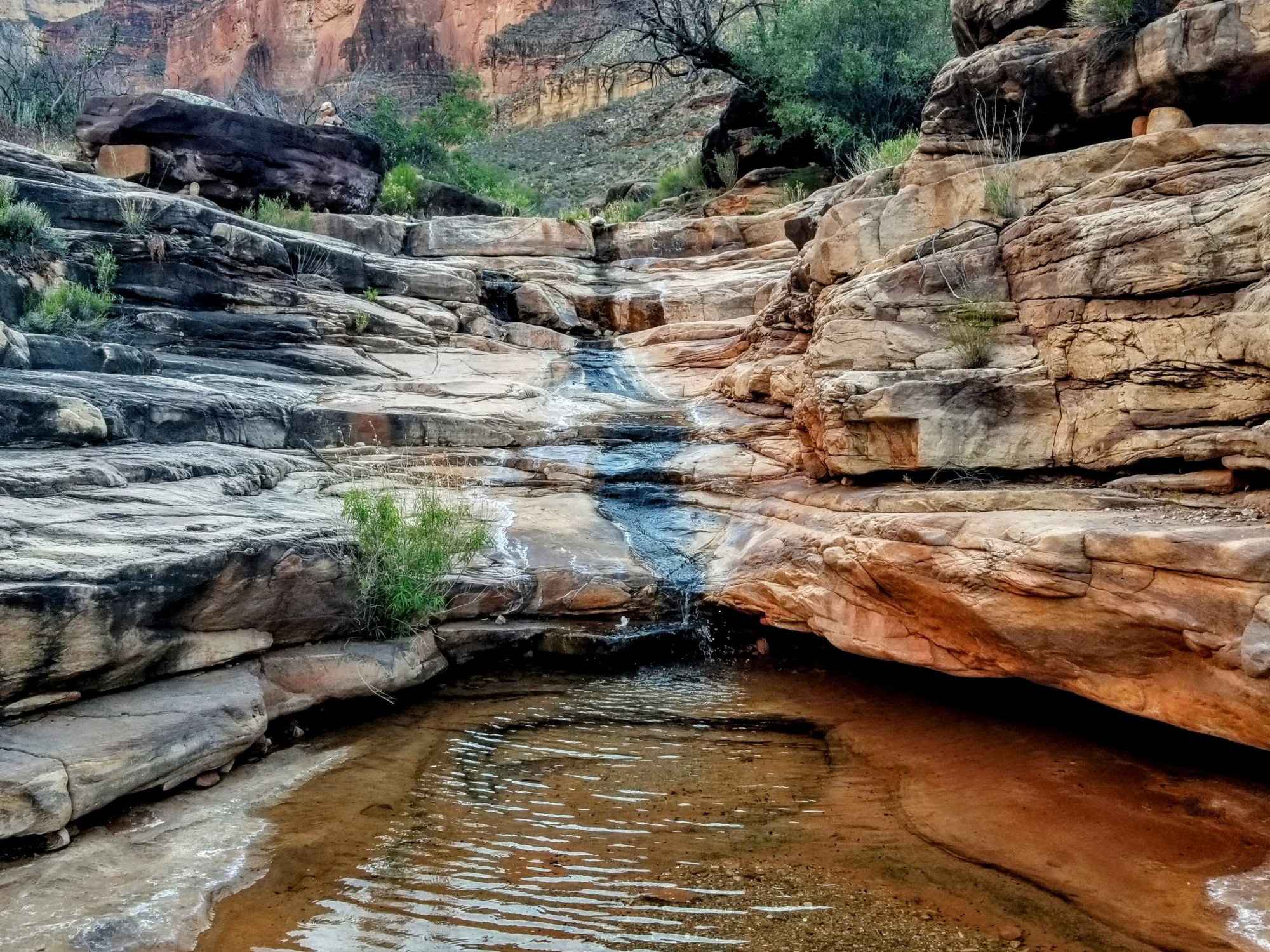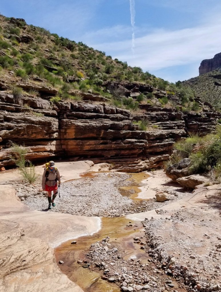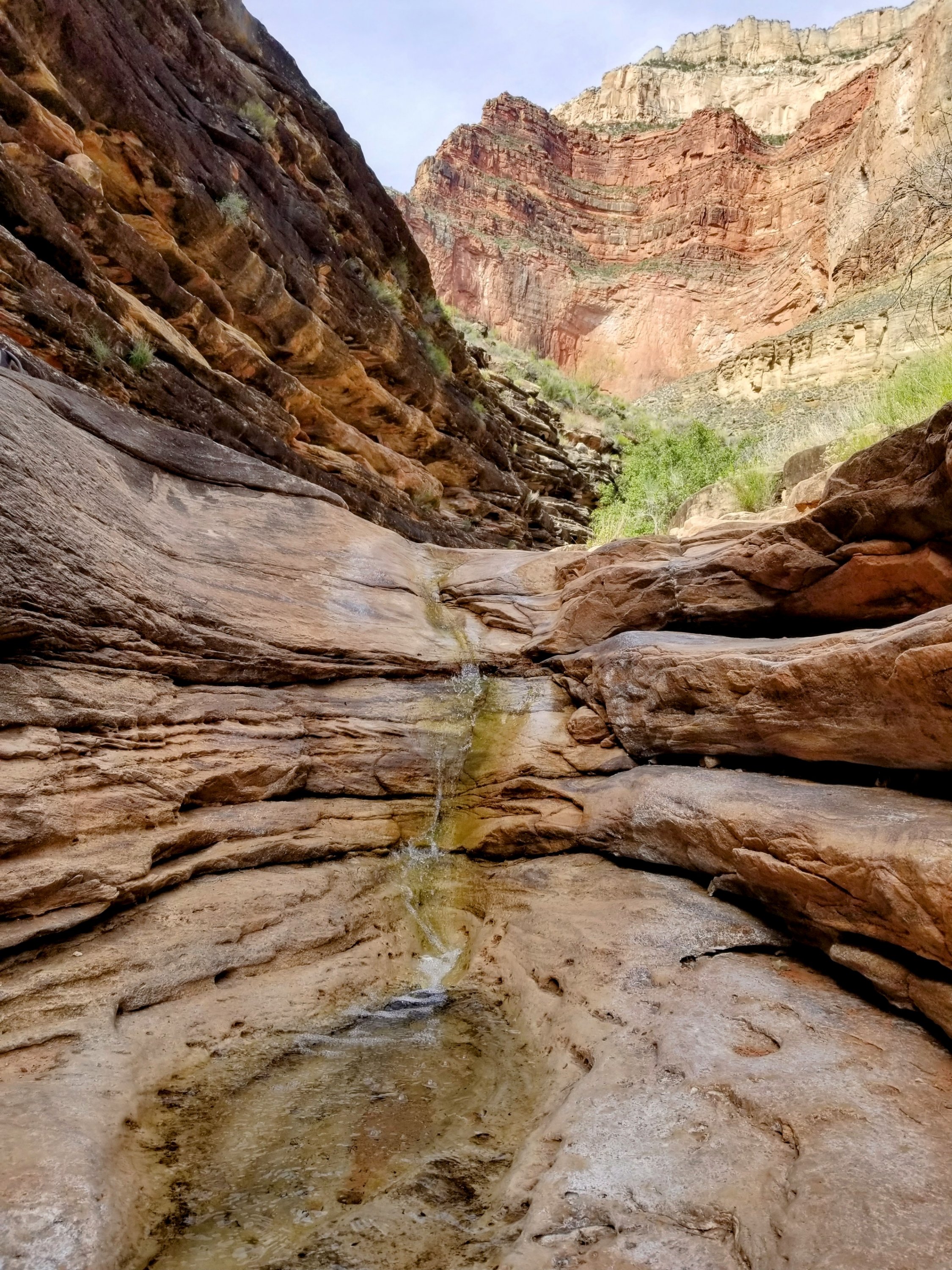 Collecting cooler, fresher water is certainly a godsend. Ruby Canyon becomes quite narrow in the back where the Tonto Trail crosses and I have memories of caching my water here a couple years ago when I did my Tonto FKT. Ruby was one of my favorite canyons on the tonto because of it’s narrow shelves of slickrock. Back then it was bone dry in February and now there are little rivulets of water trickling over the slickrock making gurgling sounds and glittering with sunlight. It’s already a dreamy, magical place and now with this water it’s simply heaven.