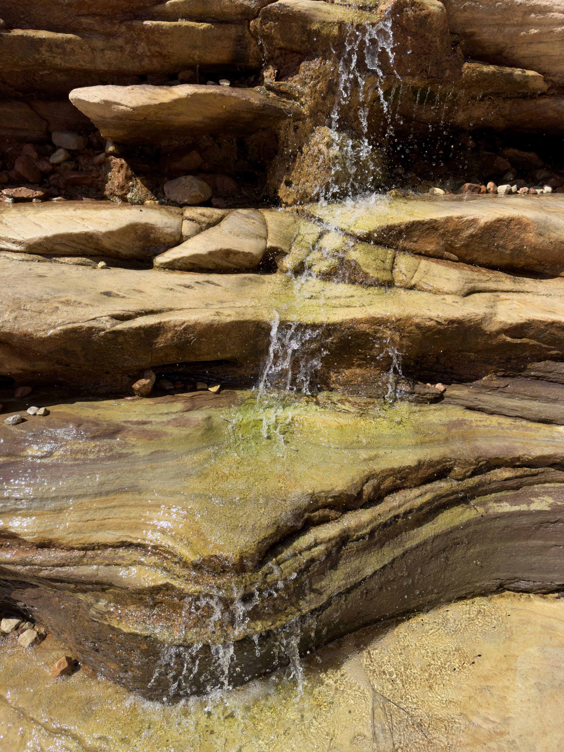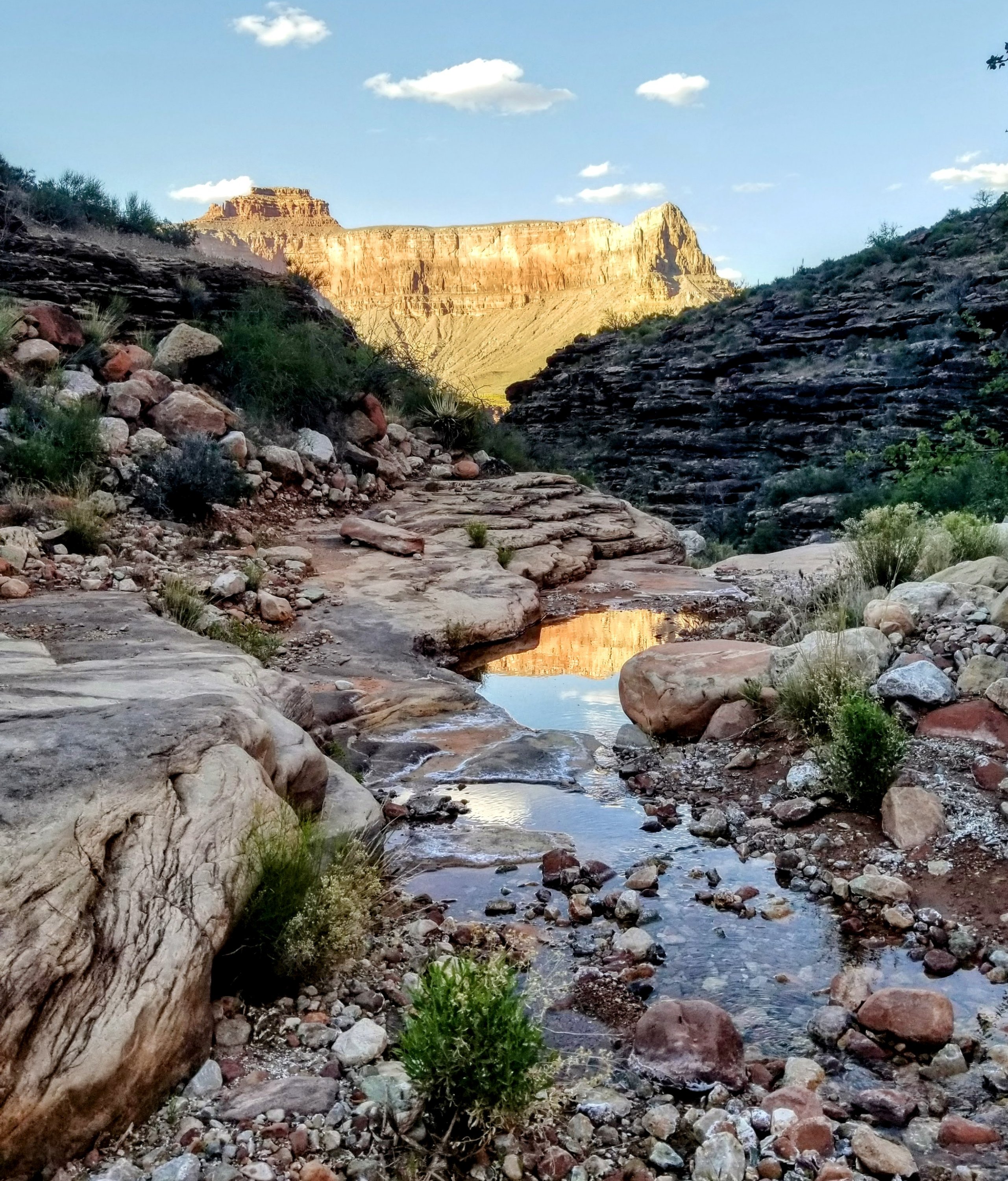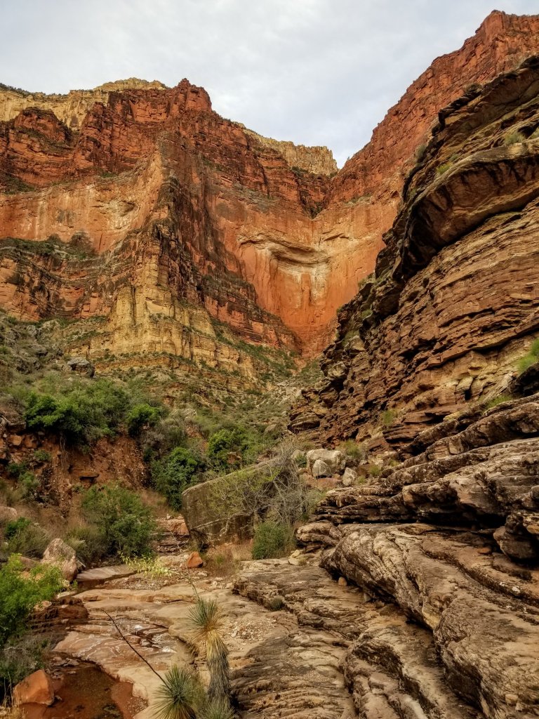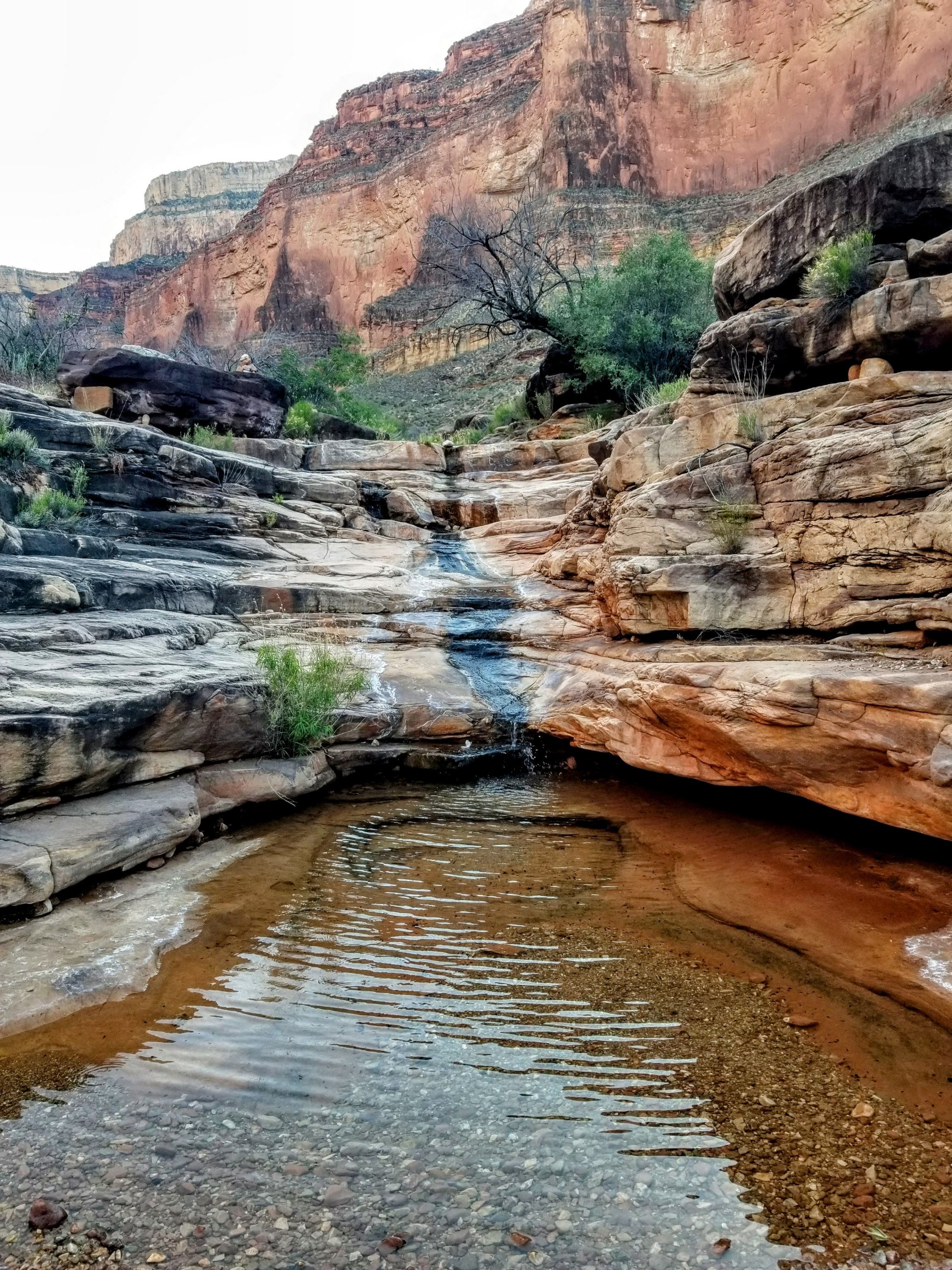 Collecting cooler, fresher water is certainly a godsend. Ruby Canyon becomes quite narrow in the back where the Tonto Trail crosses and I have memories of caching my water here a couple years ago when I did my Tonto FKT. Ruby was one of my favorite canyons on the tonto because of it’s narrow shelves of slickrock. Back then it was bone dry in February and now there are little rivulets of water trickling over the slickrock making gurgling sounds and glittering with sunlight. It’s already a dreamy, magical place and now with this water it’s simply heaven.