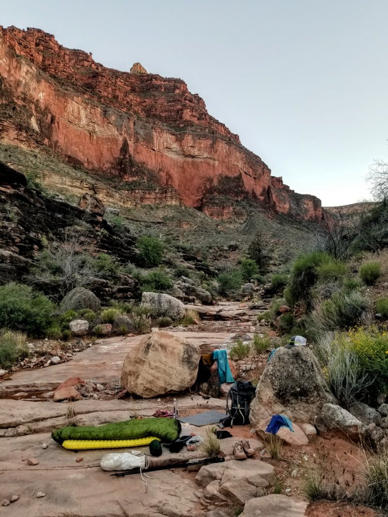 We finally reach Sapphire Canyon at close to 6pm and start scouting places to camp. Upon our arrival we are pleased to find there is plenty of water here too, hooray!! It’s a rare treat to camp next to water every night in the Grand Canyon without going to the river. Certainly not normal, but gratefully welcomed. This is a special year.