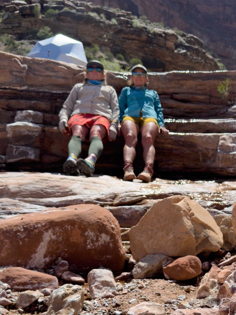 As we eat our dinners, we listen to the sounds of the crickets and frogs starting up. I wonder if it’s going to be as loud as last night? It’s a balmy evening, it feels so wonderful to sit out in the warm night air without a jacket. As I am cleaning up after dinner I see a little frog go hopping by. I suppose this is the new normal. We are sleeping next to frogs again. Once the sky fades to dark, the stars begin to emerge and Rockin points out the Big Diper hanging directly above us. We welcome the opportunity to star gaze without the need for tents, something we have always needed on other trips together. There is the slightest breeze that picks up every once in a while, it will be just enough that I will cover my body with my sleeping bag like a blanket, but I know I won’t need to zip it up. I am so ready to lay flat on my back and take a look at those stars before closing my eyes for a solid night’s sleep. Here’s to another great day in the greatest of Canyons.