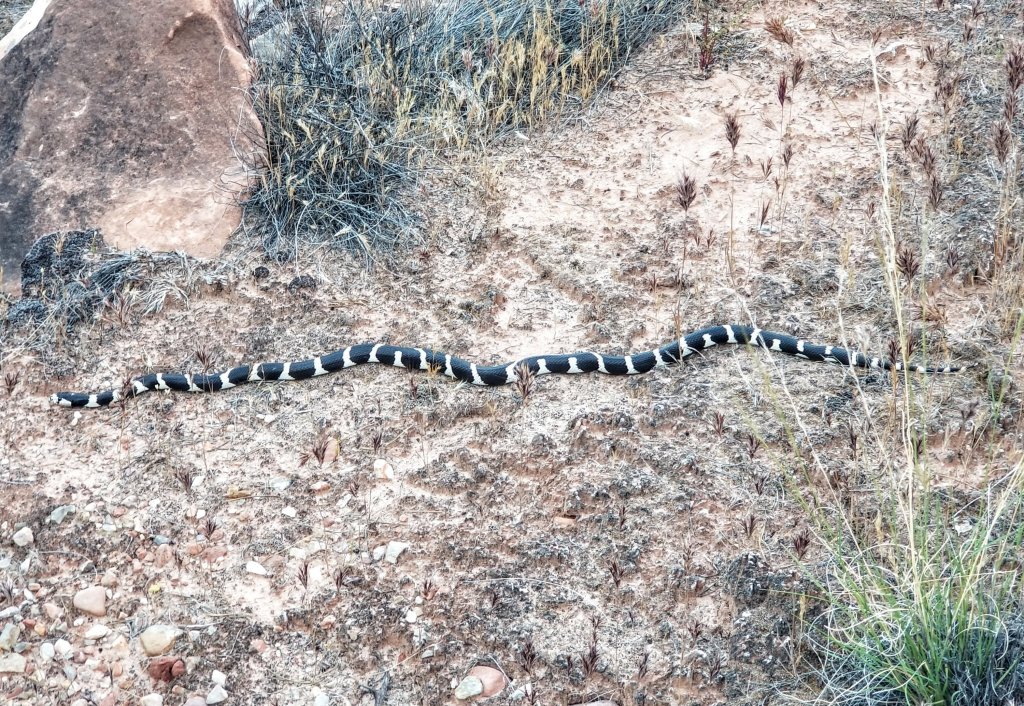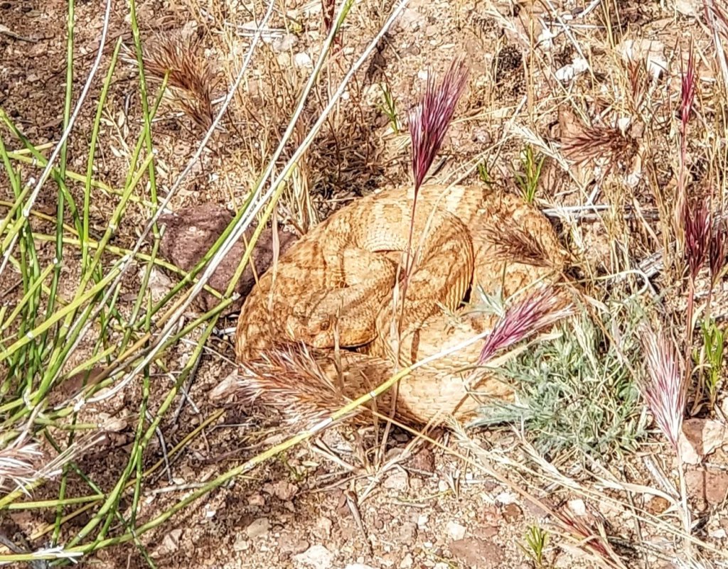 Shortly after that, we run into our first snake. It’s very pale, almost an albino like color, a faded yellow. It’s curled up and does’t move as we approach. I can see it’s diamond shaped head and matted skin, it’s rattle is hidden but I’m positive this is a venomous specimen.