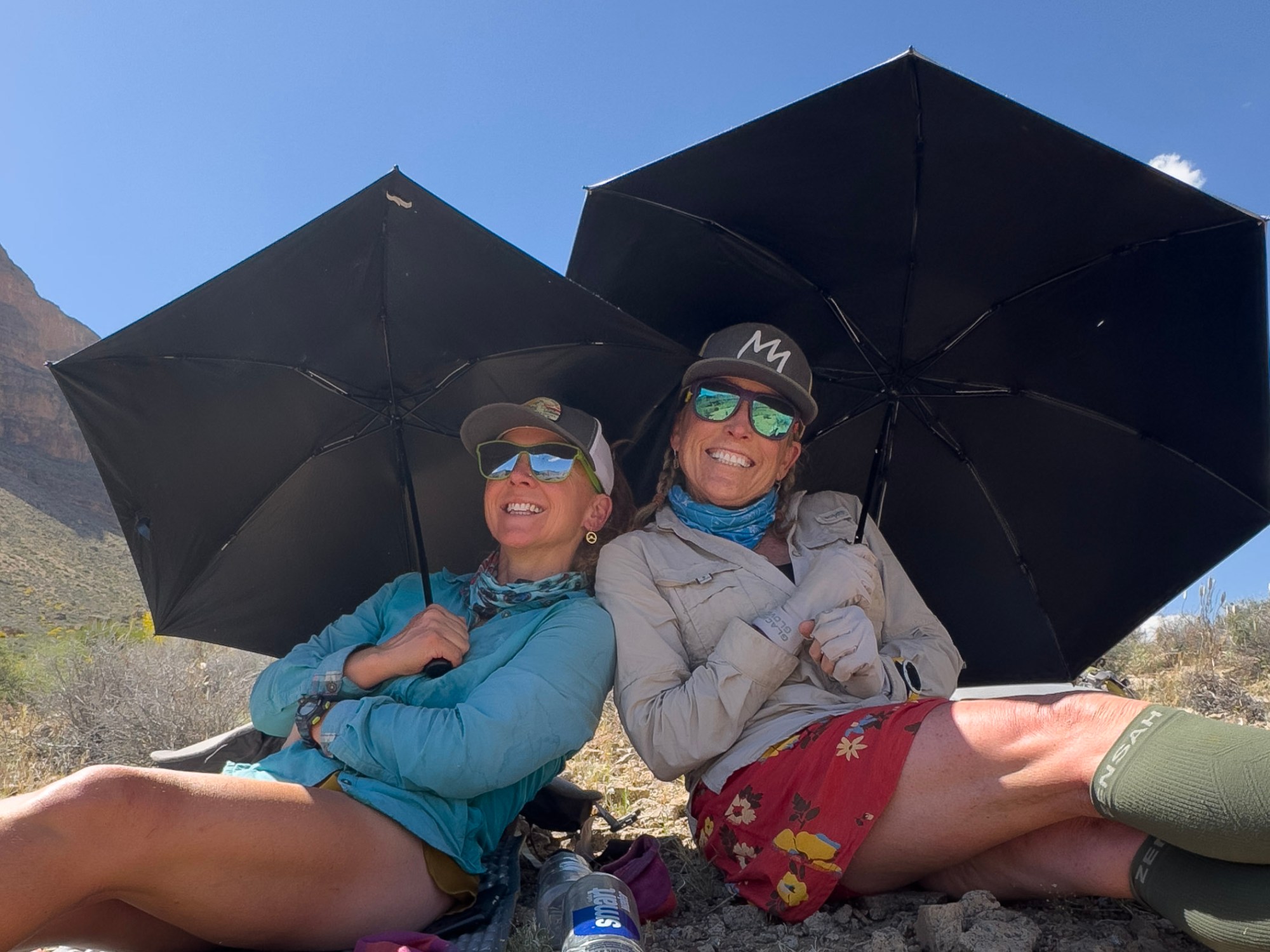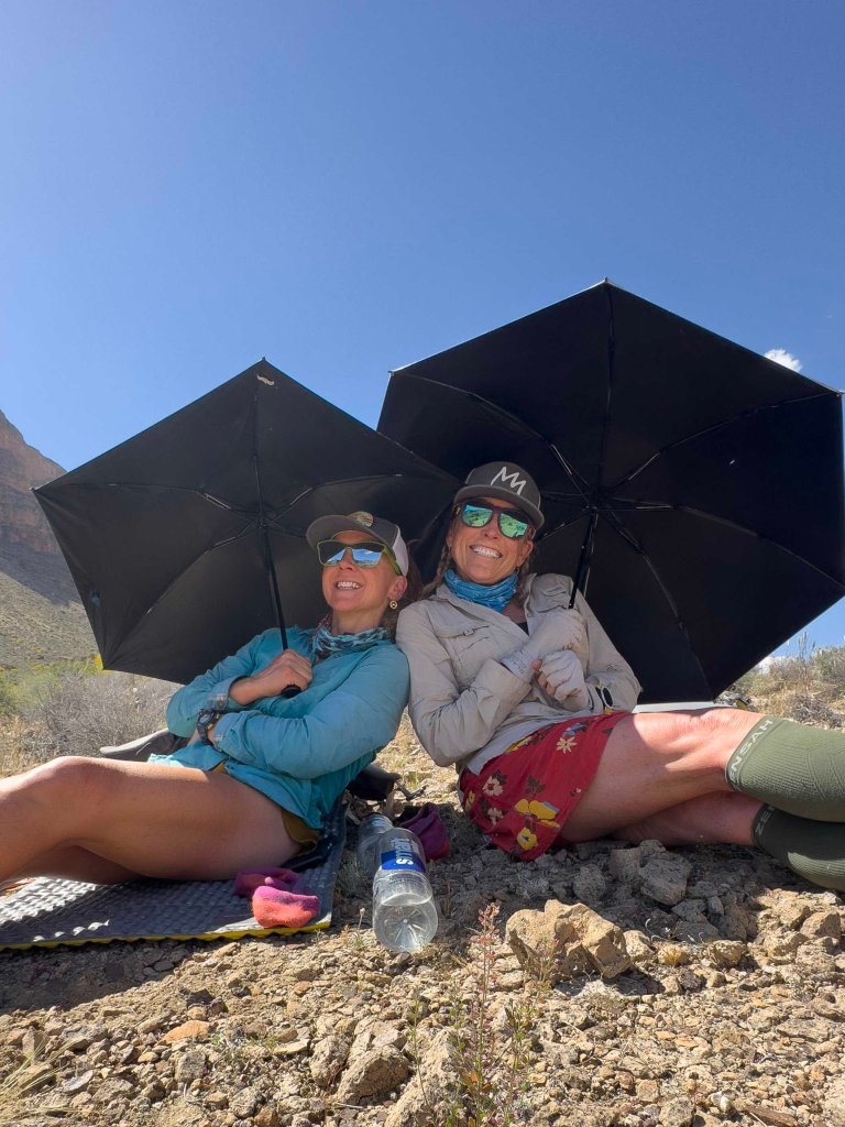 Around 9:00am we plop ourselves down in the flat open space of the tonto, holding open our umbrellas for required shade. If we didn’t have these umbrellas, I think we would melt. When I check my thermometer it is already 85F. As we drink water and have a snack we stare at the ground from under our fabricated shade. I laugh hard because Rockin’ s feet sticking out from under her umbrella look like the wicked witch from The Wizard of Oz, it’s creepy and hilarious at the same time.