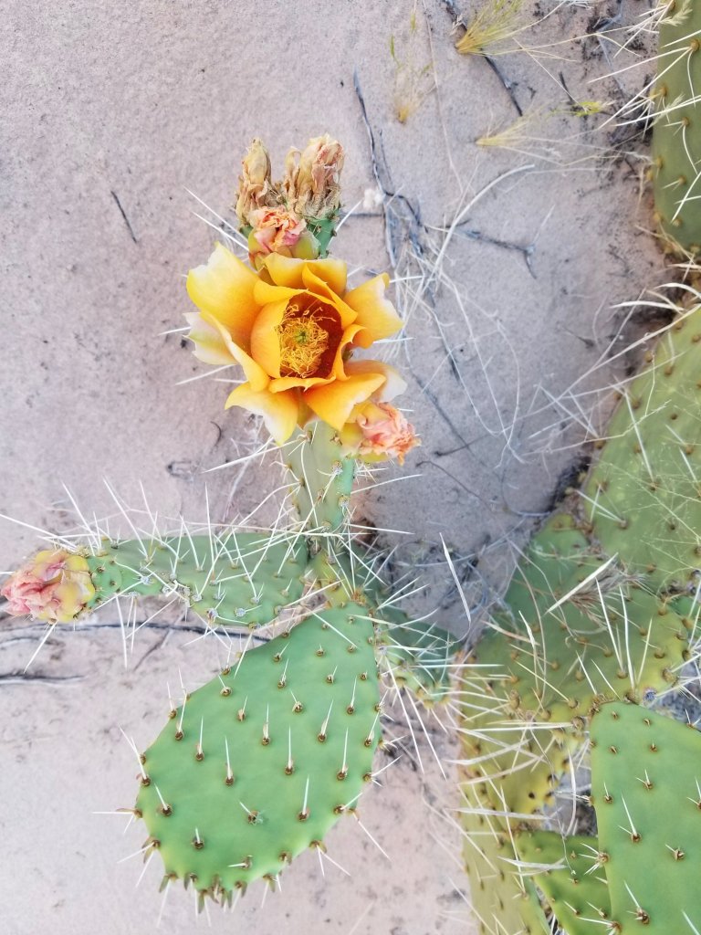 Eventually we feel the pull to be setting up camp and briefly consider staying down here at the beach so we scout around for campsites. Nestled in the sand dunes there is a gorgeous Prickly Pear boasting yellow flowers that I fall in love with. What a lucky cactus getting to live here I think. Such beauty! Camping here would mean lots of sand so we decide to walk back to Boucher Creek where we can camp on dirt next to a good water source and not get sand in everything.