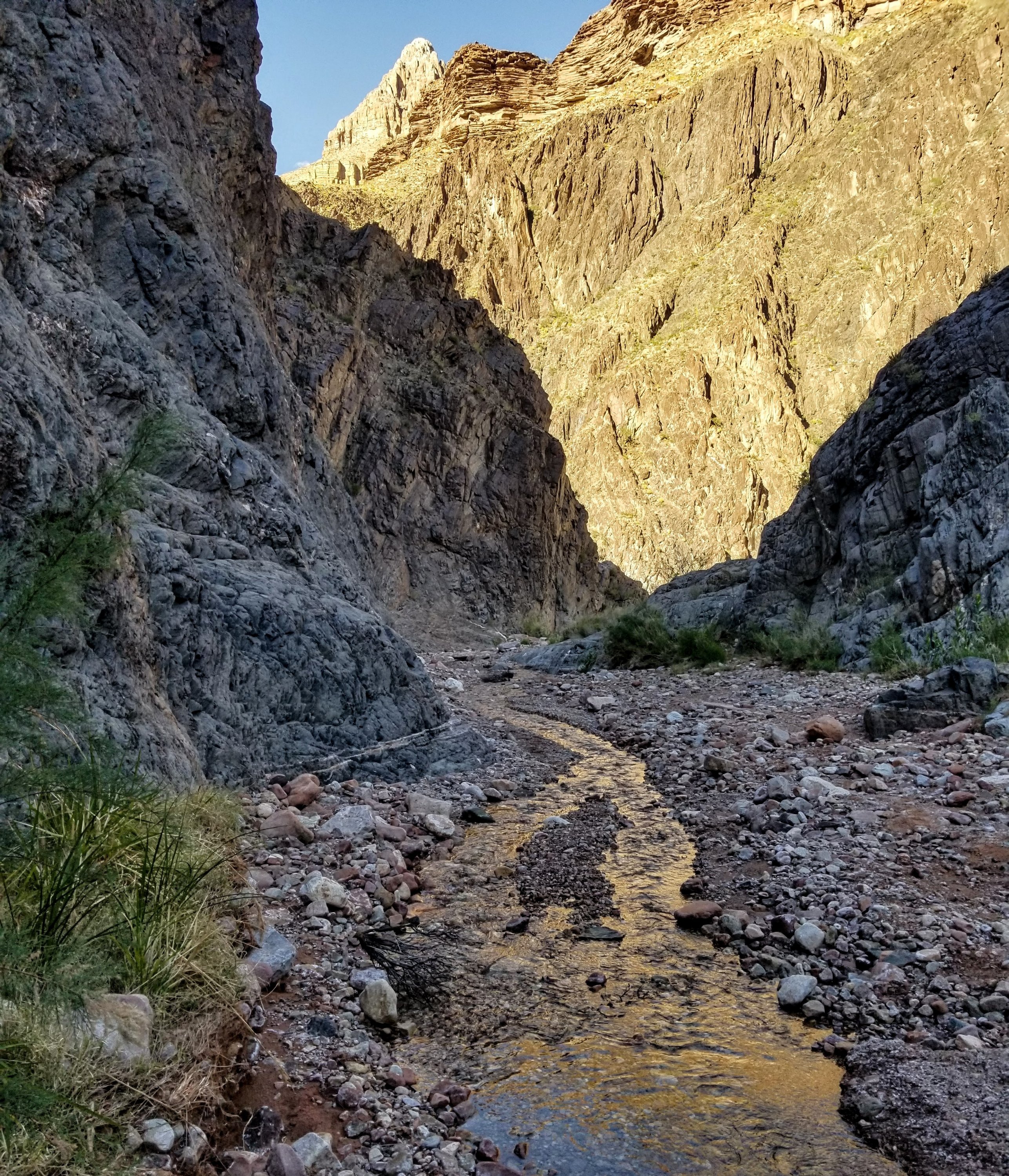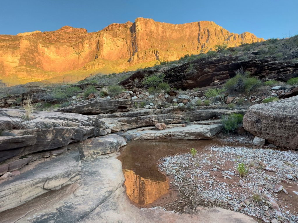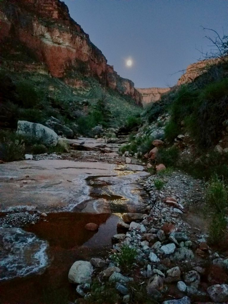 I love the hike down through the wash to the Rapids, this year the flowing water is nearly constant. It’s such a treat to walk along, having that sound in the backdrop of my thoughts. The towering walls surrounding us are some of the oldest rock in the Canyon, I feel embraced by their wisdom. It’s rugged down here, and in places overgrown with vegetation. It takes us about 45 minutes to walk down, first picking our feet over rocks and hopping the creek, then eventually dipping right into the creek, submerging our feet, which feels amazing. The canyon walls become narrower in places, providing shade and with that the ambient lighting at this time of day is simply magical, ethereal even.